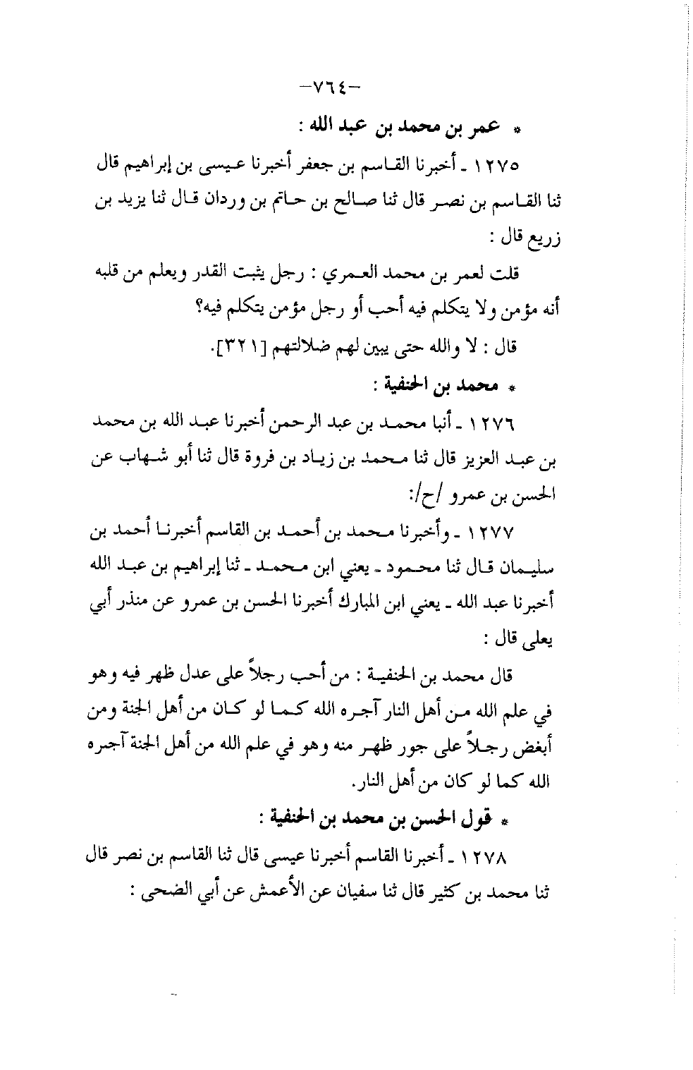 1275 - أَخْبَرَنَا الْقَاسِمُ بْنُ جَعْفَرٍ , أَخْبَرَنَا عِيسَى بْنُ إِبْرَاهِيمَ، قَالَ: ثنا الْقَاسِمُ بْنُ نَصْرٍ، قَالَ: ثنا صَالِحُ بْنُ حَاتِمِ بْنِ وَرْدَانَ، قَالَ: ثنا يَزِيدُ بْنُ زُرَيْعٍ، قَالَ: قُلْتُ لِعُمَرَ بْنِ مُحَمَّدٍ الْعُمَرِيِّ: رَجُلٌ يُثْبِتُ §الْقَدَرَ وَيَعْلَمُ مِنْ قَلْبِهِ أَنَّهُ مُؤْمِنٌ وَلَا يَتَكَلَّمُ فِيهِ أَحَبُّ إِلَيْكَ، أَوْ رَجُلٌ مُؤْمِنٌ يَتَكَلَّمُ فِيهِ؟ قَالَ: لَا وَاللَّهِ حَتَّى يُبَيِّنَ لَهُمْ ضَلَالَتَهُمْ