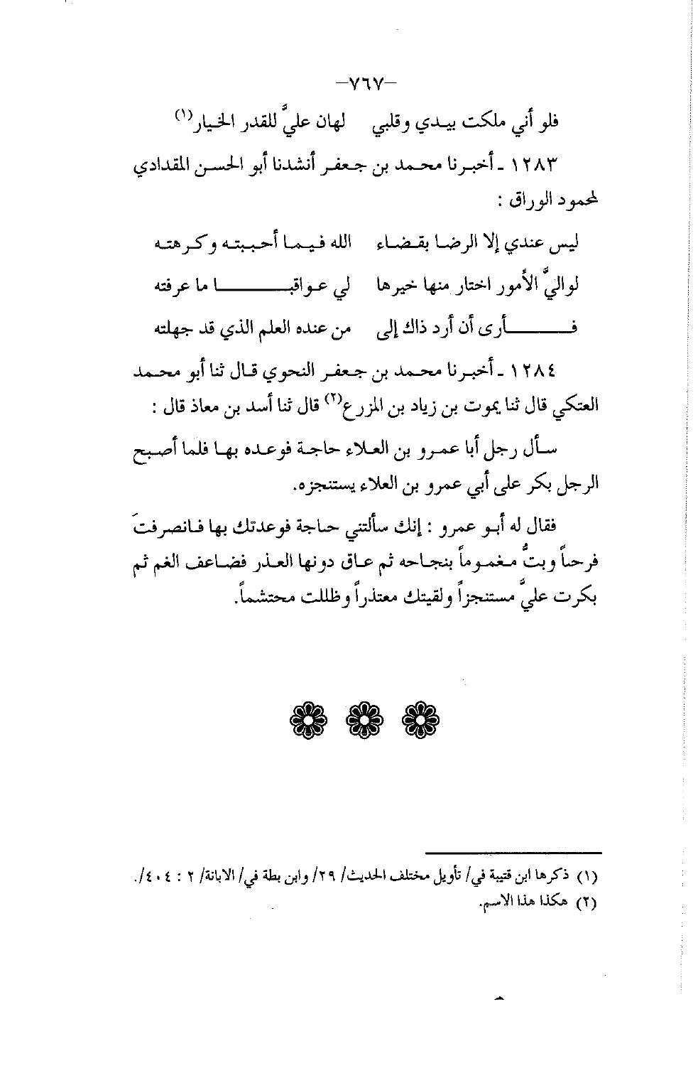 1283 - مُحَمَّدُ بْنُ جَعْفَرٍ أَنْشَدَنَا أَبُو الْحَسَنِ الْمِقْدَادِيُّ لِمَحْمُودٍ الْوَرَّاقِ: