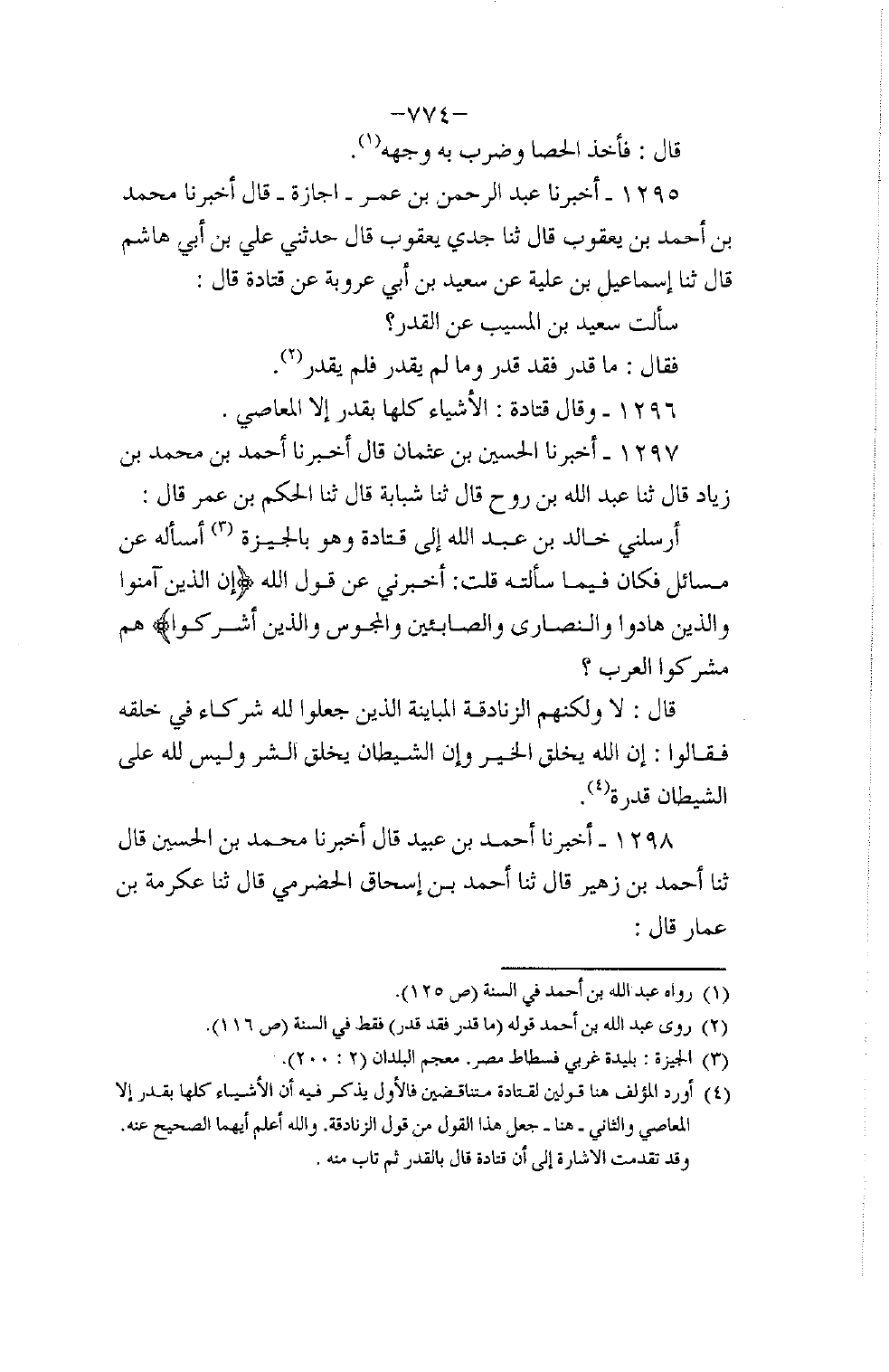1297 - أَخْبَرَنَا الْحَسَنُ بْنُ عُثْمَانَ، قَالَ: أَخْبَرَنَا أَحْمَدُ بْنُ مُحَمَّدِ بْنِ زِيَادٍ، قَالَ: ثنا عَبْدُ اللَّهِ بْنُ رَوْحٍ، قَالَ: ثنا شَبَابَةُ، قَالَ: ثنا الْحَكَمُ بْنُ عُمَرَ، قَالَ: أَرْسَلَنِي خَالِدُ بْنُ عَبْدِ اللَّهِ إِلَى قَتَادَةَ وَهُوَ بِالْجِيْزَةِ أَسْأَلُهُ عَنْ مَسَائِلَ، فَكَانَ فِيمَا سَأَلْتُ، قُلْتُ: أَخْبِرْنِي عَنْ قَوْلِ اللَّهِ: {§إِنَّ الَّذِينَ آمَنُوا وَالَّذِينَ هَادُوا وَالصَّابِئِينَ وَالنَّصَارَى وَالْمَجُوسَ وَالَّذِينَ أَشْرَكُوا} [الحج: 17] ، هُمْ مُشْرِكُو الْعَرَبِ؟ قَالَ: لَا، وَلَكِنَّهُمُ الزَّنَادِقَةُ الْمُبَايِنَةُ الَّذِينَ جَعَلُوا لِلَّهِ شُرَكَاءَ فِي خَلْقِهِ، فَقَالُوا: إِنَّ اللَّهَ يَخْلُقُ الْخَيْرَ، وَإِنَّ الشَّيْطَانَ يَخْلُقُ الشَّرَّ، وَلَيْسَ لِلَّهِ عَلَى الشَّيْطَانِ قُدْرَةٌ