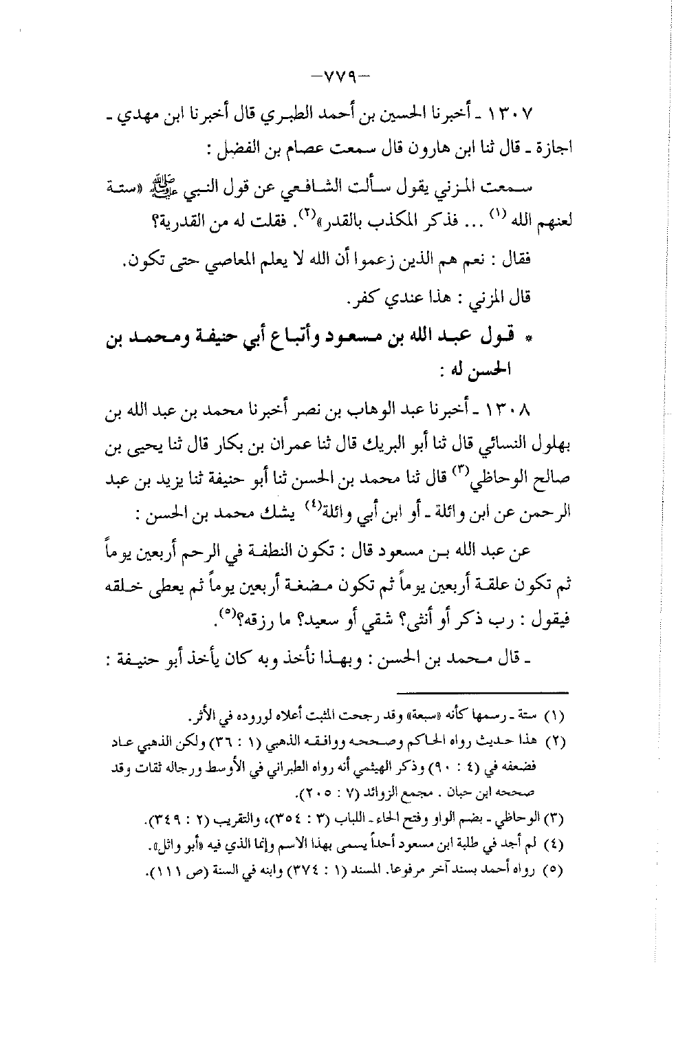أَخْبَرَنَا عَبْدُ الْوَهَّابِ بْنُ نَصْرٍ , أَخْبَرَنَا مُحَمَّدُ بْنُ عَبْدِ اللَّهِ بْنِ بُهْلُولٍ النَّسَائِيُّ، قَالَ: ثنا أَبُو الْبَرِيكِ، قَالَ: ثنا عِمْرَانُ بْنُ بَكَّارٍ، قَالَ: ثنا يَحْيَى بْنُ صَالِحٍ الْوُحَاظِيُّ، قَالَ: ثنا مُحَمَّدُ بْنُ الْحَسَنِ , ثنا أَبُو حَنِيفَةَ , ثنا يَزِيدُ بْنُ عَبْدِ الرَّحْمَنِ , عَنْ أَبِي وَائِلَةَ، أَوِ ابْنِ وَائِلَةَ، يَشُكُّ مُحَمَّدُ بْنُ الْحَسَنِ، عَنْ عَبْدِ اللَّهِ بْنِ مَسْعُودٍ قَالَ: تَكُونُ §النُّطْفَةُ فِي الرَّحِمِ أَرْبَعِينَ يَوْمًا، ثُمَّ تَكُونُ عَلَقَةً أَرْبَعِينَ يَوْمًا، ثُمَّ تَكُونُ مُضْغَةً أَرْبَعِينَ يَوْمًا، ثُمَّ يُعْطِي خَلْقَهُ، فَيَقُولُ: رَبِّ ذَكَرٌ أَوْ أُنْثَى؟ شَقِيٌّ أَوْ سَعِيدٌ؟ مَا رِزْقُهُ؟ قَالَ مُحَمَّدُ بْنُ الْحَسَنِ: وَبِهَذَا نَأْخُذُ وَبِهِ كَانَ يَأْخُذُ أَبُو حَنِيفَةَ -[780]-: الشَّقِيُّ مِنْ شَقِيَ فِي بَطْنِ أُمِّهِ، وَالسَّعِيدُ مِنْ وُعِظَ بِغَيْرِهِ