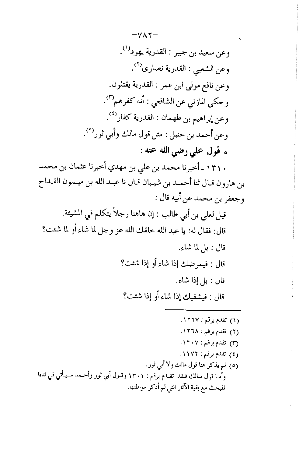 1310 - أَخْبَرَنَا مُحَمَّدُ بْنُ عَلِيِّ بْنِ مَهْدِيٍّ , أَخْبَرَنَا عُثْمَانُ بْنُ مُحَمَّدِ بْنِ هَارُونَ، قَالَ: ثنا أَحْمَدُ بْنُ شَيْبَانَ، قَالَ: نا عَبْدُ اللَّهِ بْنُ مَيْمُونٍ الْقَدَّاحُ , وَجَعْفَرُ بْنُ مُحَمَّدٍ , عَنْ أَبِيهِ، قَالَ: قِيلَ لِعَلِيِّ بْنِ أَبِي طَالِبٍ: إِنَّ هَا هُنَا رَجُلًا يَتَكَلَّمُ فِي الْمَشِيئَةِ، قَالَ: وَقَالَ لَهُ يَا عَبْدَ اللَّهِ §خَلَقَكَ اللَّهُ عَزَّ وَجَلَّ لِمَا شَاءَ أَوْ شِئْتَ؟ قَالَ: بَلْ لِمَا شَاءَ، قَالَ: فَيُمْرِضُكَ إِذَا شَاءَ أَوْ إِذَا شِئْتَ؟ قَالَ: بَلْ إِذَا شَاءَ، قَالَ: فَيَشْفِيكَ إِذَا شَاءَ أَوْ إِذَا شِئْتَ؟ قَالَ: إِذَا شَاءَ، قَالَ: فَيُمِيتُكَ إِذَا شَاءَ أَوْ إِذَا شِئْتَ؟ -[783]- قَالَ: إِذَا شَاءَ، قَالَ: فَيُدْخِلُكَ حَيْثُ شَاءَ أَوْ شِئْتَ؟ قَالَ: حَيْثُ شَاءَ، قَالَ: وَاللَّهِ لَوْ قُلْتَ غَيْرَ هَذَا لَضَرَبْتُ الَّذِي فِيهِ عَيْنَاكَ بِالسَّيْفِ، قَالَ: ثُمَّ تَلَا: {وَمَا يَذْكُرُونَ إِلَّا أَنْ يَشَاءَ اللَّهُ هُوَ أَهْلُ التَّقْوَى وَأَهْلُ الْمَغْفِرَةِ} [المدثر: 56]