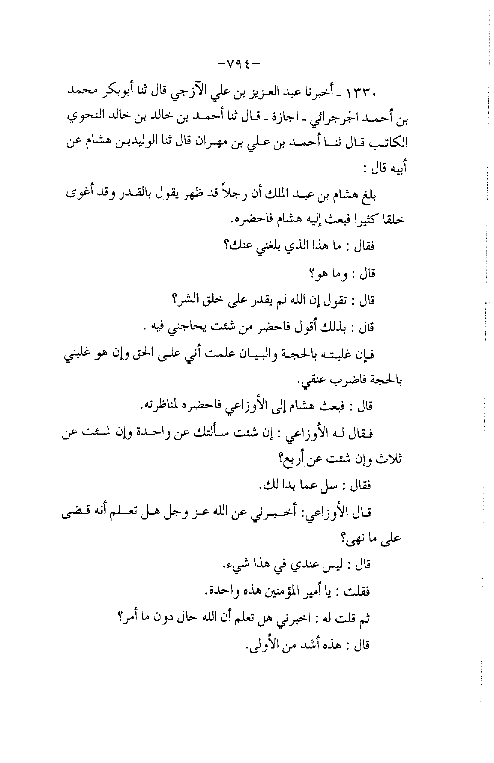 1330 - أَخْبَرَنَا عَبْدُ الْعَزِيزِ بْنُ عَلِيٍّ الْأَزَجِيُّ، قَالَ: ثنا أَبُو بَكْرٍ مُحَمَّدُ بْنُ أَحْمَدَ الْجَرْجَرَائِيُّ إِجَازَةً، قَالَ: ثنا أَحْمَدُ بْنُ خَالِدٍ النَّحْوِيُّ الْكَاتِبُ، قَالَ: ثنا أَحْمَدُ بْنُ عَلِيِّ بْنِ مِهْرَانَ، قَالَ: ثنا الْوَلِيدُ بْنُ هِشَامٍ , عَنْ أَبِيهِ، قَالَ: بَلَغَ هِشَامَ بْنَ عَبْدِ الْمَلِكِ أَنَّ رَجُلًا قَدْ ظَهَرَ يَقُولُ بِالْقَدَرِ وَقَدْ أَغْوَى خَلْقًا كَثِيرًا، فَبَعَثَ إِلَيْهِ هِشَامٌ فَأَحْضَرَهُ، فَقَالَ: مَا هَذَا الَّذِي §بَلَغَنِي عَنْكَ؟ قَالَ: وَمَا هُوَ؟ قَالَ: تَقُولُ: إِنَّ اللَّهَ لَمْ يَقْدِرْ عَلَى خَلْقِ الشَّرِّ قَالَ: بِذَلِكَ أَقُولُ، فَأَحْضِرْ مَنْ شِئْتَ يُحَاجِّنِي فِيهِ، فَإِنْ غَلَبْتُهُ بِالْحُجَّةِ وَالْبَيَانِ عَلِمْتَ أَنِّي عَلَى الْحَقِّ، وَإِنْ هُوَ غَلَبَنِي بِالْحُجَّةِ فَاضْرِبْ عُنُقِي، قَالَ: فَبَعَثَ هِشَامٌ إِلَى الْأَوْزَاعِيِّ فَأَحْضَرَهُ لِمُنَاظَرَتِهِ فَقَالَ لَهُ الْأَوْزَاعِيُّ: إِنْ شِئْتَ سَأَلْتُكَ عَنْ وَاحِدَةٍ، وَإِنْ شِئْتَ عَنْ ثَلَاثٍ، وَإِنْ شِئْتَ عَنْ أَرْبَعٍ؟ فَقَالَ: سَلْ عَمَّا بَدَا لَكَ، قَالَ الْأَوْزَاعِيُّ: أَخْبِرْنِي عَنِ اللَّهِ عَزَّ وَجَلَّ، هَلْ تَعْلَمُ أَنَّهُ قَضَى عَلَيَّ مَا نَهَى؟ قَالَ: لَيْسَ عِنْدِي فِي هَذَا شَيْءٌ، فَقُلْتُ: يَا أَمِيرَ الْمُؤْمِنِينَ هَذِهِ وَاحِدَةٌ، ثُمَّ قُلْتُ لَهُ: أَخْبِرْنِي هَلْ تَعْلَمُ أَنَّ اللَّهَ حَالَ دُونَ مَا أَمَرَ؟ قَالَ: هَذِهِ أَشَدُّ مِنَ الْأُولَى -[795]-، فَقُلْتُ: يَا أَمِيرَ الْمُؤْمِنِينَ هَذِهِ اثْنَتَانِ، ثُمَّ قُلْتُ لَهُ: هَلْ تَعْلَمْ أَنَّ اللَّهَ أَعَانَ عَلَى مَا حَرَّمَ؟ قَالَ: هَذِهِ أَشَدُّ مِنَ الْأُولَى وَالثَّانِيَةِ، فَقُلْتُ: يَا أَمِيرَ الْمُؤْمِنِينَ هَذِهِ ثَلَاثٌ، قَدْ حَلَّ بِهَا ضَرْبُ عُنُقِهِ، فَأَمَرَ بِهِ هِشَامٌ فَضُرِبَتْ عُنُقُهُ، ثُمَّ قَالَ لِلْأَوْزَاعِيِّ: يَا أَبَا عَمْرٍو فَسِّرْ لَنَا هَذِهِ الْمَسَائِلَ، فَقَالَ: نَعَمْ يَا أَمِيرَ الْمُؤْمِنِينَ، سَأَلْتُهُ: هَلْ يَعْلَمُ أَنَّ اللَّهَ قَضَى عَلَيَّ مَا نَهَى؟ نَهَى آدَمَ عَنْ أَكْلِ الشَّجَرَةِ ثُمَّ قَضَى عَلَيْهِ فَأَكَلَهَا، وَسَأَلْتُهُ: هَلْ يَعْلَمُ أَنَّ اللَّهَ حَالَ دُونَ مَا أَمَرَ؟ أَمَرَ إِبْلِيسَ بِالسُّجُودِ لِآدَمَ ثُمَّ حَالَ بَيْنَهُ وَبَيْنَ السُّجُودِ، وَسَأَلْتُهُ: هَلْ يَعْلَمُ أَنَّ اللَّهَ أَعَانَ عَلَى مَا حَرَّمَ؟ حَرَّمَ الْمَيْتَةَ وَالدَّمَ ثُمَّ أَعَانَنَا عَلَى أَكْلِهِ فِي وَقْتِ الِاضْطِرَارِ إِلَيْهِ، قَالَ هِشَامٌ: وَالرَّابِعَةُ مَا هِيَ يَا أَبَا عَمْرٍو؟ قَالَ: كُنْتُ أَقُولُ: مَشِيئَتُكَ مَعَ اللَّهِ أَمْ دُونَ اللَّهِ؟ فَإِنْ قَالَ: مَعَ اللَّهِ فَقَدِ اتَّخَذَ مَعَ اللَّهِ شَرِيكًا، أَوْ قَالَ: دُونَ اللَّهِ فَقَدِ انْفَرَدَ بِالرُّبُوبِيَّةِ، فَأَيُّهُمَا أَجَابَنِي فَقَدَ حَلَّ ضَرْبُ عُنُقِهِ بِهَا، قَالَ هِشَامٌ: حَيَاةُ الْخَلْقِ وَقَوَامُ الدِّينِ بِالْعُلَمَاءِ