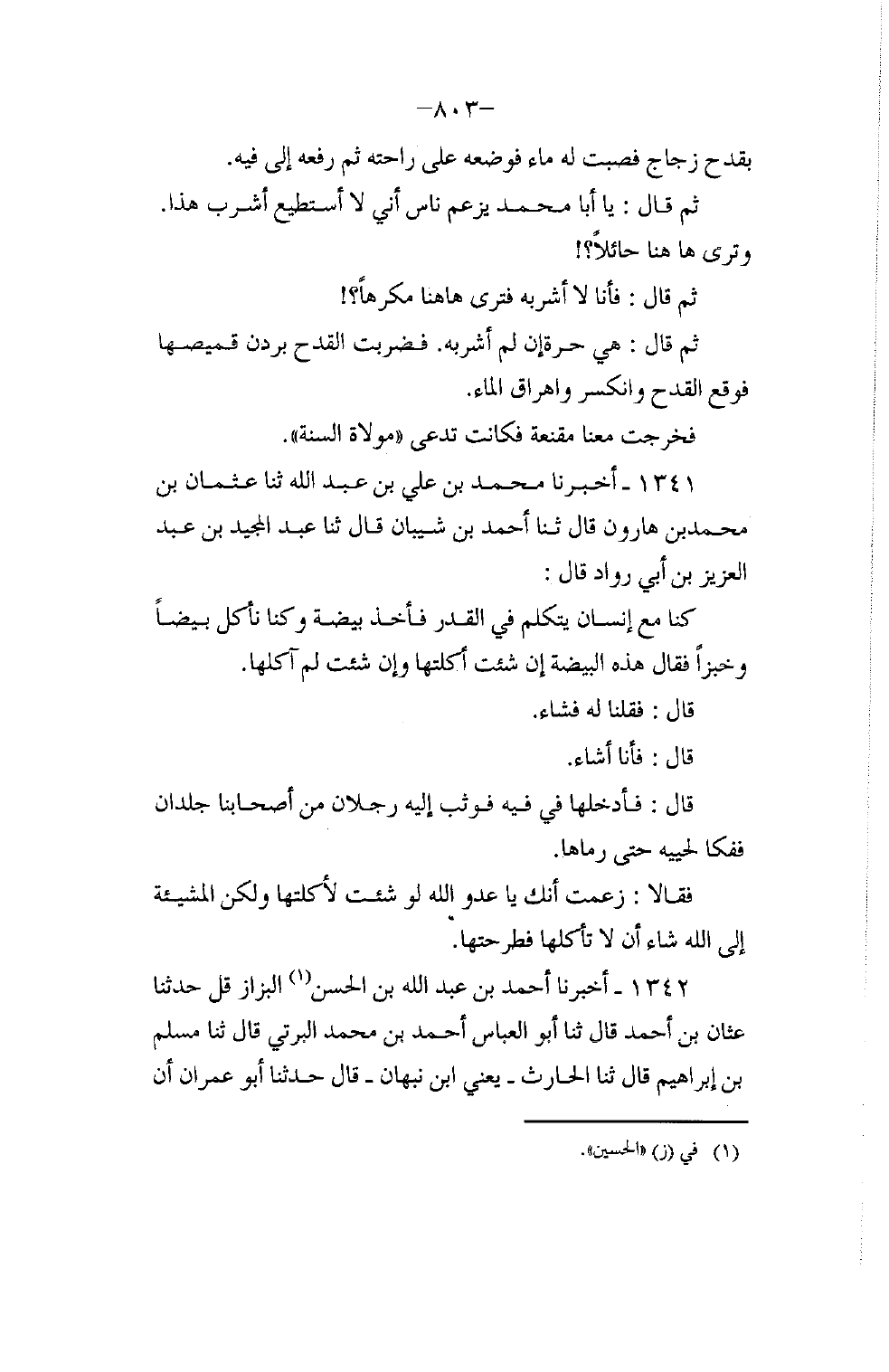 1341 - أَخْبَرَنَا مُحَمَّدُ بْنُ عَلِيِّ بْنِ عَبْدِ اللَّهِ , ثنا عُثْمَانُ بْنُ مُحَمَّدِ بْنِ هَارُونَ، قَالَ: ثنا أَحْمَدُ بْنُ سِنَانٍ، قَالَ: ثنا عَبْدُ الْمَجِيدِ بْنُ عَبْدِ الْعَزِيزِ بْنِ أَبِي رَوَّادٍ، قَالَ: كُنَّا مَعَ إِنْسَانٍ يَتَكَلَّمُ فِي الْقَدَرِ، فَأَخَذَ بَيْضَةً، وَكُنَّا نَأْكُلُ بِيضًا وَخُبْزًا، فَقَالَ: هَذِهِ الْبَيْضَةُ إِنْ شِئْتُ أَكَلْتُهَا وَإِنْ شِئْتُ لَمْ آكُلْهَا، قَالَ: فَقُلْنَا لَهُ: فَشَأْ، قَالَ: فَأَنَا أَشَاءُ، قَالَ: فَأَدْخَلَهَا فِي فِيهِ، فَوَثَبَ إِلَيْهِ رَجُلَانِ مِنْ أَصْحَابِنَا جَلْدَانِ فَفَكَّا لَحْيَيْهِ حَتَّى رَمَاهَا، فَقَالَا: زَعَمْتَ أَنَّكَ يَا عَدُوَّ اللَّهِ لَوْ شِئْتَ لَأَكَلْتَهَا، وَلَكِنَّ §الْمَشِيئَةَ إِلَى اللَّهِ شَاءَ أَنْ لَا تَأْكُلَهَا فَطَرَحْتَهَا