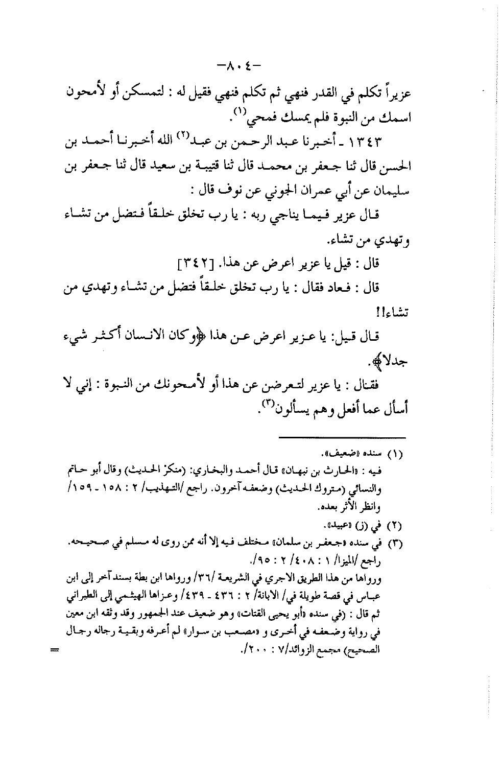 1343 - أَخْبَرَنَا عَبْدُ الرَّحْمَنِ بْنُ عَبْدِ اللَّهِ , أَخْبَرَنَا أَحْمَدُ بْنُ الْحَسَنِ، قَالَ: ثنا جَعْفَرُ بْنُ مُحَمَّدٍ، قَالَ: ثنا قُتَيْبَةُ بْنُ سَعِيدٍ، قَالَ: ثنا جَعْفَرُ بْنُ سُلَيْمَانَ , عَنْ أَبِي عِمْرَانَ الْجَوْنِيِّ , عَنْ نَوْفٍ، قَالَ: قَالَ عُزَيْرٌ فِيمَا يُنَاجِي رَبَّهُ: يَا رَبِّ، §تَخْلُقُ خَلْقًا فَتُضِلُّ مِنْ تَشَاءُ وَتَهْدِي مِنْ تَشَاءُ، قَالَ: قِيلَ: يَا عُزَيْرُ، أَعْرِضْ عَنْ هَذَا، قَالَ: فَعَادَ، فَقَالَ: يَا رَبِّ تَخْلُقُ خَلْقًا فَتُضِلُّ مِنْ تَشَاءَ وَتَهْدِي مِنْ تَشَاءُ، قَالَ: قِيلَ: يَا عُزَيْرُ، أَعْرِضْ عَنْ هَذَا، {وَكَانَ الْإِنْسَانُ أَكْثَرَ شَيْءٍ جَدَلًا} [الكهف: 54] فَقَالَ: يَا عُزَيْرُ، لَتُعْرِضَنَّ عَنْ هَذَا أَوْ لَأَمْحُوَنَّكَ مِنَ النُّبُوَّةِ، إِنِّي لَا أُسْأَلُ عَمَّا أَفْعَلُ وَهُمْ يُسْأَلُونَ -[805]- وَقَالَ عَلِيُّ بْنُ الْعَبَّاسِ بْنِ الرُّومِيِّ الشَّاعِرُ: