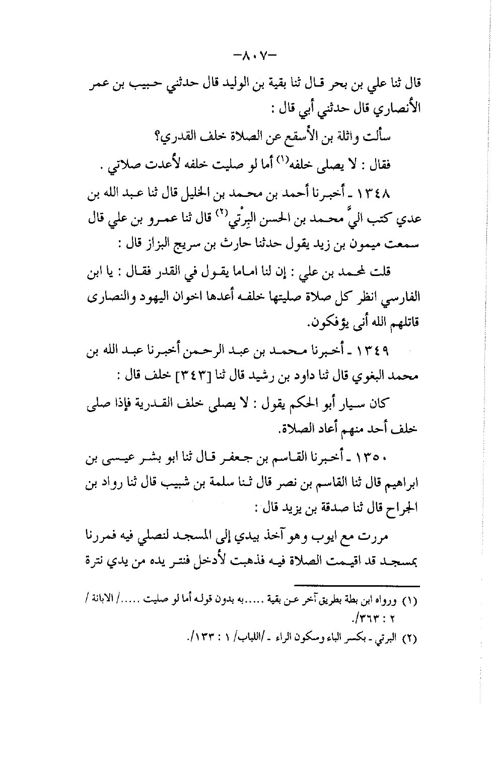 1348 - أَخْبَرَنَا أَحْمَدُ بْنُ مُحَمَّدِ بْنِ الْخَلِيلِ، قَالَ: ثنا عَبْدُ اللَّهِ بْنُ عَدِيٍّ، كَتَبَ إِلَيَّ مُحَمَّدُ بْنُ الْحَسَنِ الْبِرْتِيُّ قَالَ: ثنا عَمْرُو بْنُ عَلِيٍّ، قَالَ: سَمِعْتُ مَيْمُونَ بْنَ زَيْدٍ، يَقُولُ: حَدَّثَنَا حَارِثُ بْنُ سُرَيْجٍ الْبَزَّازُ، قَالَ: قُلْتُ لِمُحَمَّدِ بْنِ عَلِيٍّ: إِنَّ لَنَا إِمَامًا يَقُولُ فِي الْقَدَرِ، فَقَالَ: «يَا ابْنَ الْفَارِسِيِّ §انْظُرْ كُلَّ صَلَاةٍ صَلَّيْتَهَا خَلْفَهُ أَعِدْهَا، إِخْوَانُ الْيَهُودِ وَالنَّصَارَى قَاتَلَهُمُ اللَّهُ أَنَّى يُؤْفَكُونَ»
