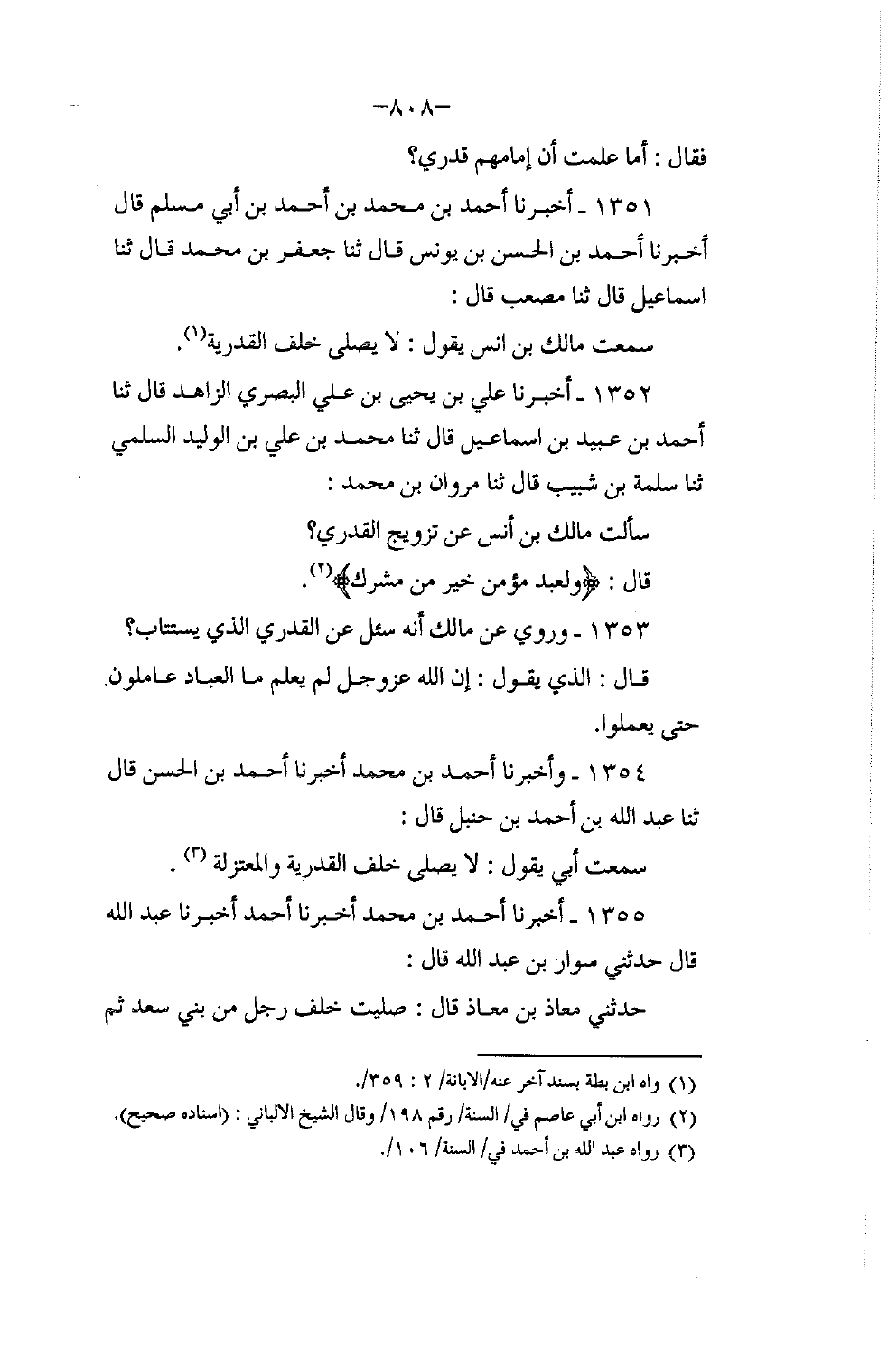 1355 - أَخْبَرَنَا أَحْمَدُ بْنُ مُحَمَّدٍ، أَخْبَرَنَا أَحْمَدُ، أَخْبَرَنَا عَبْدُ اللَّهِ، قَالَ: حَدَّثَنِي سَوَّارُ بْنُ عَبْدِ اللَّهِ، قَالَ: حَدَّثَنِي مُعَاذُ بْنُ مُعَاذٍ، قَالَ: «صَلَّيْتُ خَلْفَ رَجُلٍ مِنْ بَنِي سَعْدٍ ثُمَّ §-[809]- بَلَغَنِي أَنَّهُ قَدَرِيٌّ فَأَعَدْتُ الصَّلَاةَ بَعْدَ أَرْبَعِينَ سَنَةً، أَوْ ثَلَاثِينَ سَنَةً»