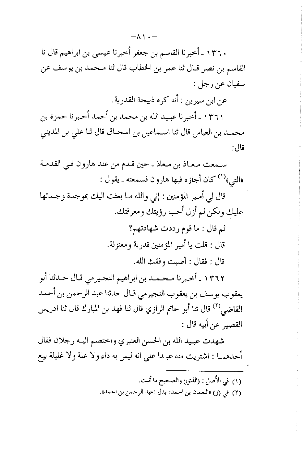 1361 - أَخْبَرَنَا عُبَيْدُ اللَّهِ بْنُ مُحَمَّدِ بْنِ أَحْمَدَ، أَخْبَرَنَا حَمْزَةُ بْنُ مُحَمَّدِ بْنِ الْعَبَّاسِ، قَالَ: ثنا إِسْمَاعِيلُ بْنُ إِسْحَاقَ، قَالَ: ثنا عَلِيُّ بْنُ الْمَدِينِيِّ، قَالَ: سَمِعْتُ مُعَاذَ بْنَ مُعَاذٍ حِينَ قَدِمَ مِنْ عِنْدِ هَارُونَ فِي الْقَدْمَةِ الَّتِي كَانَ أَجَازَهُ فِيهَا هَارُونُ فَسَمِعْتُهُ يَقُولُ: " قَالَ لِي أَمِيرُ الْمُؤْمِنِينَ: إِنِّي وَاللَّهِ مَا بَعَثْتُ إِلَيْكَ بِمَوْجِدَةٍ وَجَدْتُهَا عَلَيْكَ، وَلَكِنْ لَمْ أَزَلْ أُحِبُّ رُؤْيَتَكَ وَمَعْرِفَتَكَ "، ثُمَّ قَالَ: «§مَا قَوْمٌ رَدَدْتَ شَهَادَتَهُمْ؟» ، قَالَ: قُلْتُ: «يَا أَمِيرَ الْمُؤْمِنِينَ قَدَرِيَّةٌ، وَمُعْتَزِلَةٌ» ، قَالَ: فَقَالَ: «أَصَبْتَ وَفَّقَكَ اللَّهُ»