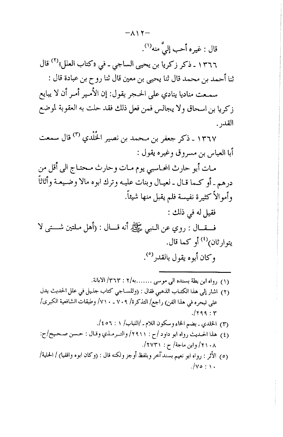 1366 - ذَكَرَ زَكَرِيَّا بْنُ يَحْيَى السَّاجِيُّ فِي كِتَابِ الْعِلَلِ قَالَ: ثنا أَحْمَدُ بْنُ مُحَمَّدٍ، قَالَ: ثنا يَحْيَى بْنُ مَعِينٍ، قَالَ: ثنا رَوْحُ بْنُ عُبَادَةَ، قَالَ: سَمِعْتُ مُنَادِيًا يُنَادِي عَلَى الْحَجَرِ يَقُولُ: «إِنَّ الْأَمِيرَ أَمَرَ أَنْ §لَا يُبَايَعَ زَكَرِيَّا بْنُ إِسْحَاقَ، وَلَا يُجَالَسَ، فَمَنْ فَعَلَ ذَلِكَ فَقَدْ حَلَّتْ بِهِ الْعُقُوبَةُ؛ لِمَوْضِعِ الْقَدَرِ»