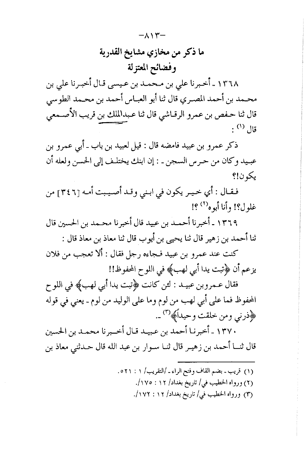 1369 - أَخْبَرَنَا أَحْمَدُ بْنُ عُبَيْدٍ، قَالَ: أَخْبَرَنَا مُحَمَّدُ بْنُ الْحُسَيْنِ، قَالَ: ثنا أَحْمَدُ بْنُ زُهَيْرٍ، قَالَ: ثنا يَحْيَى بْنُ أَيُّوبَ، قَالَ: ثنا مُعَاذُ بْنُ مُعَاذٍ، قَالَ: كُنْتُ عِنْدَ عَمْرِو بْنِ عُبَيْدٍ فَجَاءَهُ رَجُلٌ، فَقَالَ: أَلَا تَعْجَبُ مِنْ فُلَانٍ؟ يَزْعُمُ أَنَّ {تَبَّتْ يَدَا أَبِي لَهَبٍ} [المسد: 1] فِي اللَّوْحِ الْمَحْفُوظِ، فَقَالَ عَمْرُو بْنُ عُبَيْدٍ: " §لَئِنْ كَانَتْ {تَبَّتْ يَدَا أَبِي لَهَبٍ} [المسد: 1] فِي اللَّوْحِ الْمَحْفُوظِ، فَمَا عَلَى أَبِي لَهَبٍ مِنْ لَوْمٍ، وَمَا عَلَى الْوَلِيدِ مِنْ لَوْمٍ " يَعْنِي فِي قَوْلِهِ: {ذَرْنِي وَمَنْ خَلَقْتُ وَحِيدًا} [المدثر: 11]