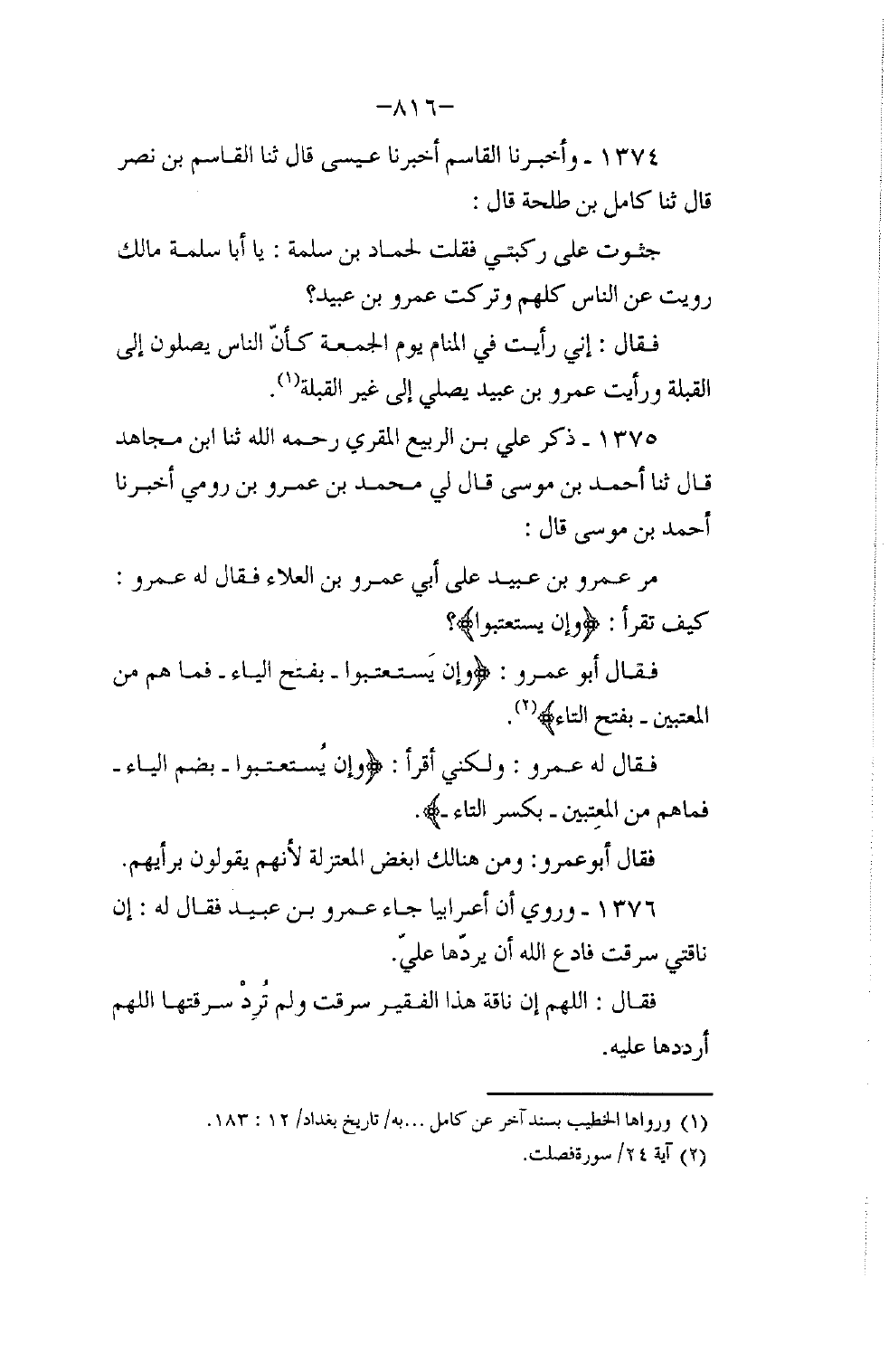 1375 - ذَكَرَ عَلِيُّ بْنُ الرَّبِيعِ الْمُقْرِئُ رَحِمَهُ اللَّهُ، ثنا ابْنُ مُجَاهِدٍ، قَالَ: ثنا أَحْمَدُ بْنُ مُوسَى، قَالَ لِي مُحَمَّدُ بْنُ عَمْرِو بْنِ رُومِيٍّ: أَخْبَرَنَا أَحْمَدُ بْنُ مُوسَى، قَالَ: مَرَّ عَمْرُو بْنُ عُبَيْدٍ عَلَى أَبِي عَمْرِو بْنِ الْعَلَاءِ فَقَالَ لَهُ عَمْرٌو: " كَيْفَ تَقْرَأُ {وَإِنْ يَسْتَعْتِبُوا} [فصلت: 24] ؟ " فَقَالَ أَبُو عَمْرٍو: وَإِنْ يَسْتَعْتِبُوا بِفَتْحِ الْيَاءِ فَمَا هُمْ مِنَ الْمُعْتَبِينَ بِفَتْحِ التَّاءِ "، فَقَالَ لَهُ عَمْرٌو: «وَلَكِنِّي أَقْرَأُ وَإِنْ يُسْتَعْتَبُوا بِضَمِّ الْيَاءِ، فَمَا هُمْ مِنَ الْمُعْتِبِينَ بِكَسْرِ التَّاءِ» فَقَالَ أَبُو عَمْرٍو: §«وَمِنْ هُنَالِكَ أُبْغِضُ الْمُعْتَزِلَةَ؛ لَأَنَّهُمْ يَقُولُونَ بِرَأْيِهِمْ»