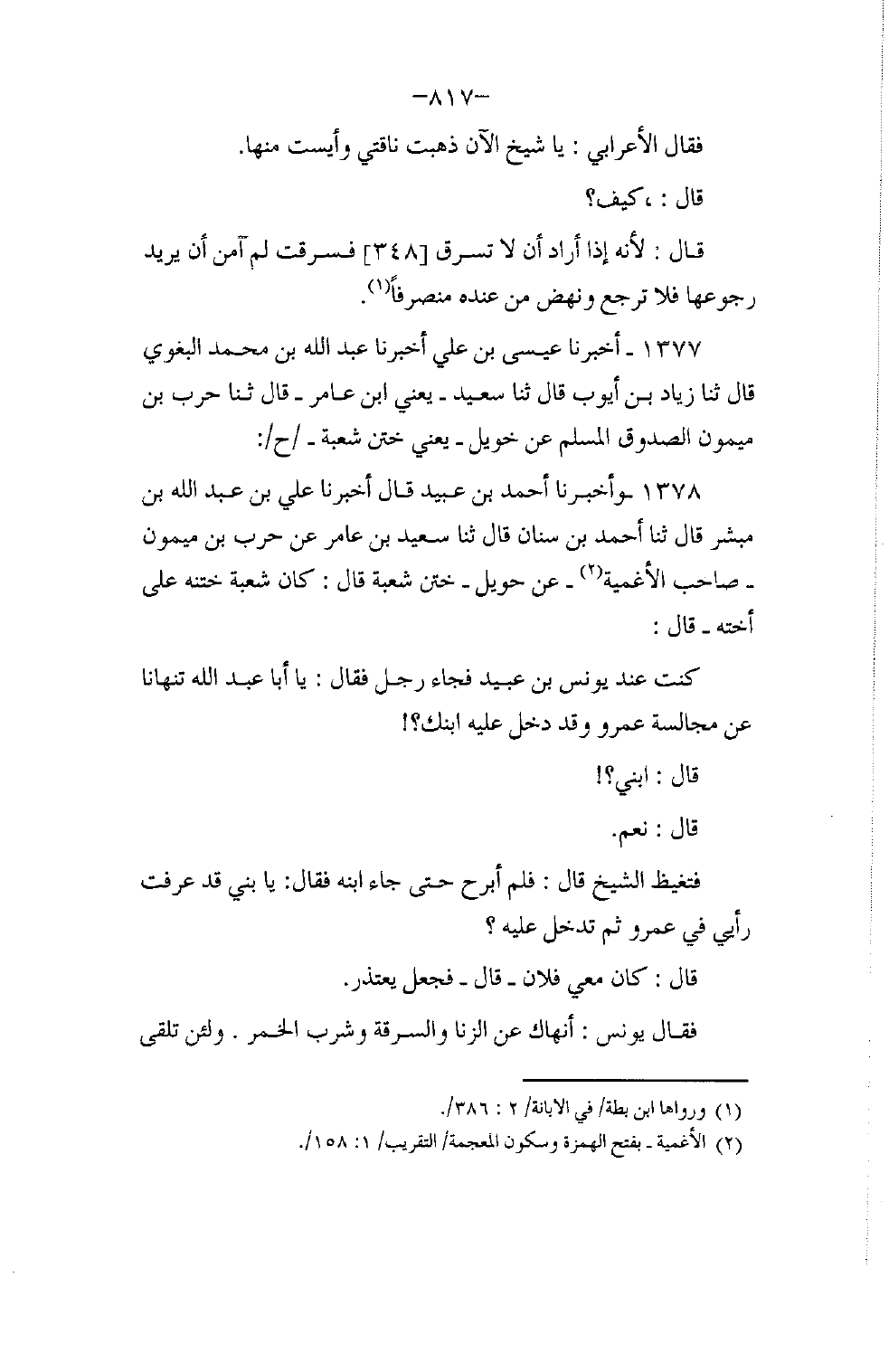 1378 - وَأَخْبَرَنَا أَحْمَدُ بْنُ عُبَيْدٍ، قَالَ: أَخْبَرَنَا عَلِيُّ بْنُ عَبْدِ اللَّهِ بْنِ مُبَشِّرٍ، قَالَ: ثنا أَحْمَدُ بْنُ سِنَانٍ، قَالَ: ثنا سَعِيدُ بْنُ عَامِرٍ، عَنْ حَرْبِ بْنِ مَيْمُونٍ صَاحِبِ الْأَغْمِيَةِ عَنْ خُوَيْلٍ خَتَنِ شُعْبَةَ، قَالَ: كَانَ شُعْبَةُ خَتَنَهُ عَلَى أُخْتِهِ، قَالَ: " كُنْتُ عِنْدَ يُونُسَ بْنِ عُبَيْدٍ فَجَاءَ رَجُلٌ، فَقَالَ: يَا أَبَا عَبْدِ اللَّهِ، تَنْهَانَا عَنْ مُجَالَسَةِ عَمْرٍو وَقَدْ دَخَلَ عَلَيْهِ ابْنُكَ، قَالَ: ابْنِي؟ قَالَ: نَعَمْ، فَتَغَيَّظَ الشَّيْخُ، قَالَ: فَلَمْ أَبْرَحْ حَتَّى جَاءَ ابْنُهُ، فَقَالَ: يَا بُنَيَّ، قَدْ عَرَفْتَ رَأْيِي فِي عَمْرٍو، ثُمَّ تَدْخُلُ عَلَيْهِ؟، قَالَ: كَانَ مَعِي فُلَانٌ، قَالَ: فَجَعَلَ يَعْتَذِرُ، فَقَالَ يُونُسُ: §أَنْهَاكَ عَنِ الزِّنَا، وَالسَّرِقَةِ، وَشُرْبِ الْخَمْرِ، وَلَأَنْ تَلْقَى -[818]- اللَّهَ عَزَّ وَجَلَّ بِهِنَّ أَحَبُّ إِلَيَّ مِنْ أَنْ تَلْقَاهُ بِرَأْيِ عَمْرٍو وَأَصْحَابِ عَمْرٍو " وَاللَّفْظُ لِحَدِيثِ زِيَادٍ