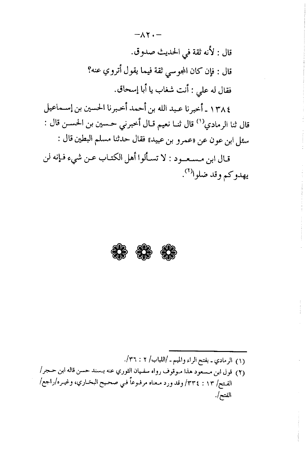 1384 - أَخْبَرَنَا عَبْدُ اللَّهِ بْنُ أَحْمَدَ، أَخْبَرَنَا الْحُسَيْنُ بْنُ إِسْمَاعِيلَ، قَالَ: ثنا الرَّمَادِيُّ، قَالَ: ثنا نُعَيْمٌ، قَالَ: أَخْبَرَنِي حُسَيْنُ بْنُ الْحَسَنِ، قَالَ: سُئِلَ ابْنُ عَوْنٍ عَنْ عَمْرِو بْنِ عُبَيْدٍ، فَقَالَ: حَدَّثَنَا مُسْلِمُ بْنُ الْبَطِينِ، قَالَ: قَالَ ابْنُ مَسْعُودٍ: §«لَا تَسْأَلُوا أَهْلَ الْكِتَابِ عَنْ شَيْءٍ؛ فَإِنَّهُ لَنْ يَهْدُوكُمْ وَقَدْ ضَلُّوا»