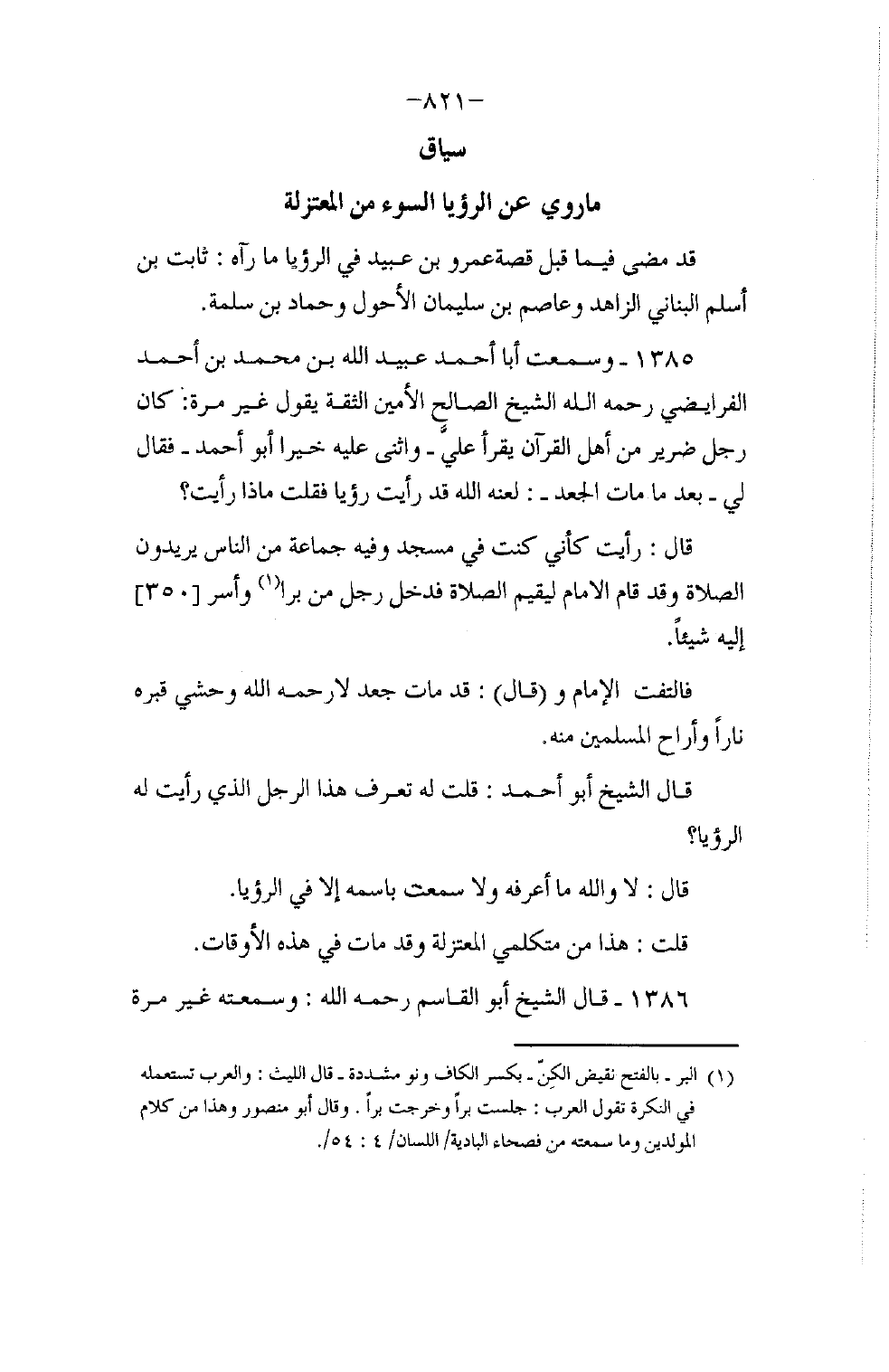 1385 - وَسَمِعْتُ 43536 أَبَا أَحْمَدَ عُبَيْدَ اللَّهِ بْنَ مُحَمَّدِ بْنِ أَحْمَدَ الْفَرائِضِيَّ رَحِمَهُ اللَّهُ الشَّيْخَ الصَّالِحَ الْأَمِينَ الثِّقَةَ يَقُولُ غَيْرَ مَرَّةٍ: كَانَ رَجُلٌ ضَرِيرٌ مِنْ أَهْلِ الْقُرْآنِ يَقْرَأُ عَلَيَّ، وَأَثْنَى عَلَيْهِ خَيْرًا أَبُو أَحْمَدَ، فَقَالَ لِي بَعْدَمَا مَاتَ الْجَعْدُ لَعَنَهُ اللَّهُ: قَدْ رَأَيْتُ رُؤْيَا، فَقُلْتُ: مَاذَا رَأَيْتَ؟ قَالَ: " رَأَيْتُ كَأَنِّي كُنْتُ فِي مَسْجِدٍ وَفِيهِ جَمَاعَةٌ مِنَ النَّاسِ يُرِيدُونَ الصَّلَاةَ، وَقَدْ قَامَ الْإِمَامُ؛ لِيُقِيمَ الصَّلَاةَ فَدَخَلَ رَجُلٌ مِنْ بَرًّا، وَأَسَرَّ إِلَيْهِ شَيْئًا، فَالْتَفَتَ الْإِمَامُ، وَقَالَ: قَدْ مَاتَ جَعْدٌ، لَا رَحِمَ اللَّهُ جَعْدًا، وَحَشَى قَبْرَهُ نَارًا، وَأَرَاحَ الْمُسْلِمِينَ مِنْهُ "، قَالَ الشَّيْخُ أَبُو أَحْمَدَ: " قُلْتُ لَهُ: تَعْرِفُ هَذَا الرَّجُلَ الَّذِي رَأَيْتَ لَهُ الرُّؤْيَا؟ " قَالَ: «لَا وَاللَّهِ مَا أَعْرِفُهُ، وَلَا سَمِعْتُ بِاسْمِهِ إِلَّا فِي الرُّؤْيَا» ، قُلْتُ: §«هَذَا مِنْ مُتَكَلِّمِي الْمُعْتَزِلَةِ وَقَدْ مَاتَ فِي هَذِهِ الْأَوْقَاتِ»