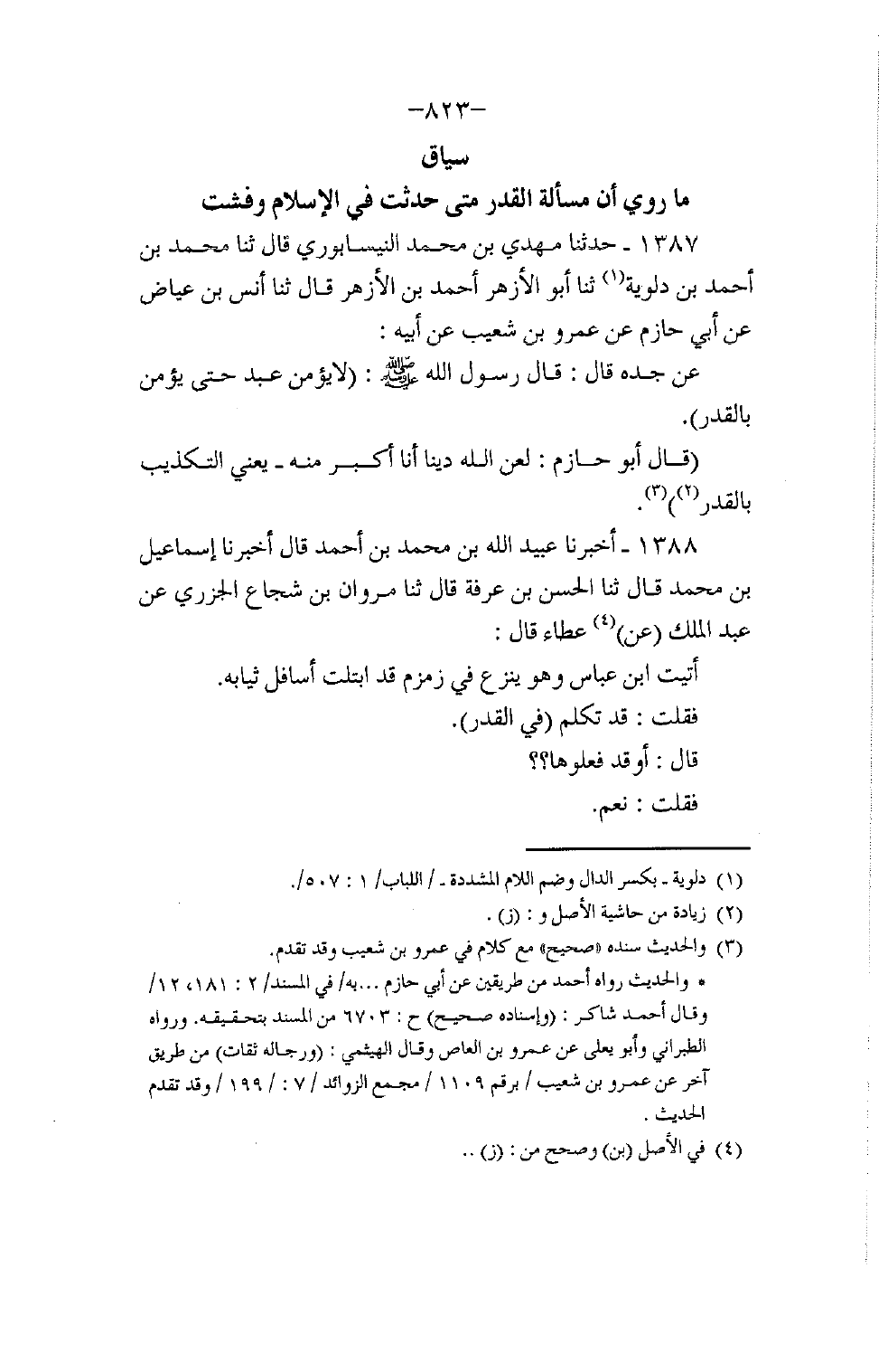 1387 - حَدَّثَنَا مَهْدِيُّ بْنُ مُحَمَّدٍ النَّيْسَابُورِيُّ، قَالَ: ثنا مُحَمَّدُ بْنُ أَحْمَدَ بْنِ دِلُّوَيْهِ، ثنا أَبُو الْأَزْهَرِ أَحْمَدُ بْنُ الْأَزْهَرِ قَالَ: ثنا أَنَسُ بْنُ عِيَاضٍ، عَنْ أَبِي حَازِمٍ، عَنْ عَمْرِو بْنِ شُعَيْبٍ، عَنْ أَبِيهِ، عَنْ جَدِّهِ، قَالَ: قَالَ رَسُولُ اللَّهِ صَلَّى اللهُ عَلَيْهِ وَسَلَّمَ: §«لَا يُؤْمِنُ عَبْدٌ حَتَّى يُؤْمِنَ بِالْقَدَرِ» قَالَ أَبُو حَازِمٍ: لَعَنَ اللَّهُ دِينًا أَنَا أَكْبَرُ مِنْهُ يَعْنِي التَّكْذِيبَ بِالْقَدَرِ