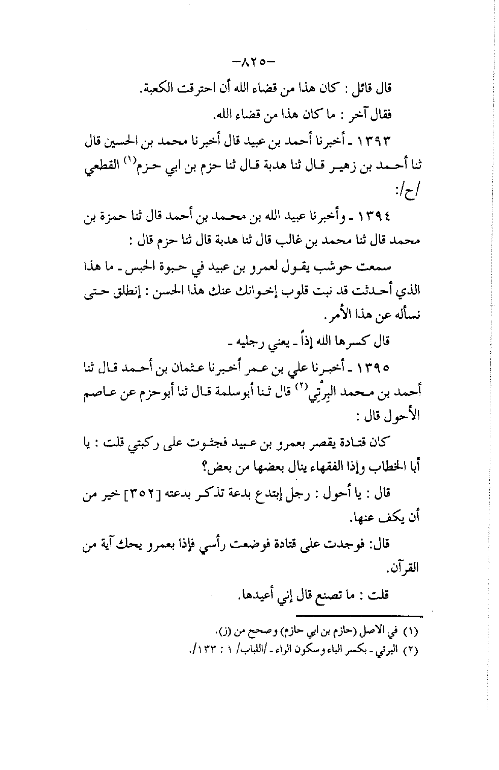 1395 - أَخْبَرَنَا عَلِيُّ بْنُ عُمَرَ، أَخْبَرَنَا عُثْمَانُ بْنُ أَحْمَدَ، قَالَ: ثنا أَحْمَدُ بْنُ مُحَمَّدٍ الْبِرْتِيُّ، قَالَ: ثنا أَبُو سَلَمَةَ، قَالَ: ثنا أَبُو حَزْمٍ، عَنْ عَاصِمٍ الْأَحْوَلِ، قَالَ: " كَانَ قَتَادَةُ يَقْصُرُ بِعَمْرِو بْنِ عُبَيْدٍ فَجَثَوْتُ عَلَى رُكْبَتَيَّ قُلْتُ: يَا أَبَا الْخَطَّابِ، وَإِذًا الْفُقَهَاءُ يَنَالُ بَعْضُهَا مِنْ بَعْضٍ؟ قَالَ: يَا أَحْوَلُ، §رَجُلٌ ابْتَدَعَ بِدْعَةً تُذْكَرُ بِدْعَتُهُ خَيْرٌ مِنْ أَنْ يُكَفَّ عَنْهَا " قَالَ: " فَوَجَدْتُ عَلَى قَتَادَةَ فَوَضَعْتُ رَأْسِي فَإِذَا بِعَمْرٍو يَحُكُّ آيَةً مِنَ الْقُرْآنِ، قُلْتُ: مَا تَصْنَعُ؟ قَالَ: إِنِّي أُعِيدُهَا -[826]-، قَالَ: فَحَكَّهَا، قَالَ: قُلْتُ أَعِدْهَا، قَالَ: لَا أَسْتَطِيعُ "
