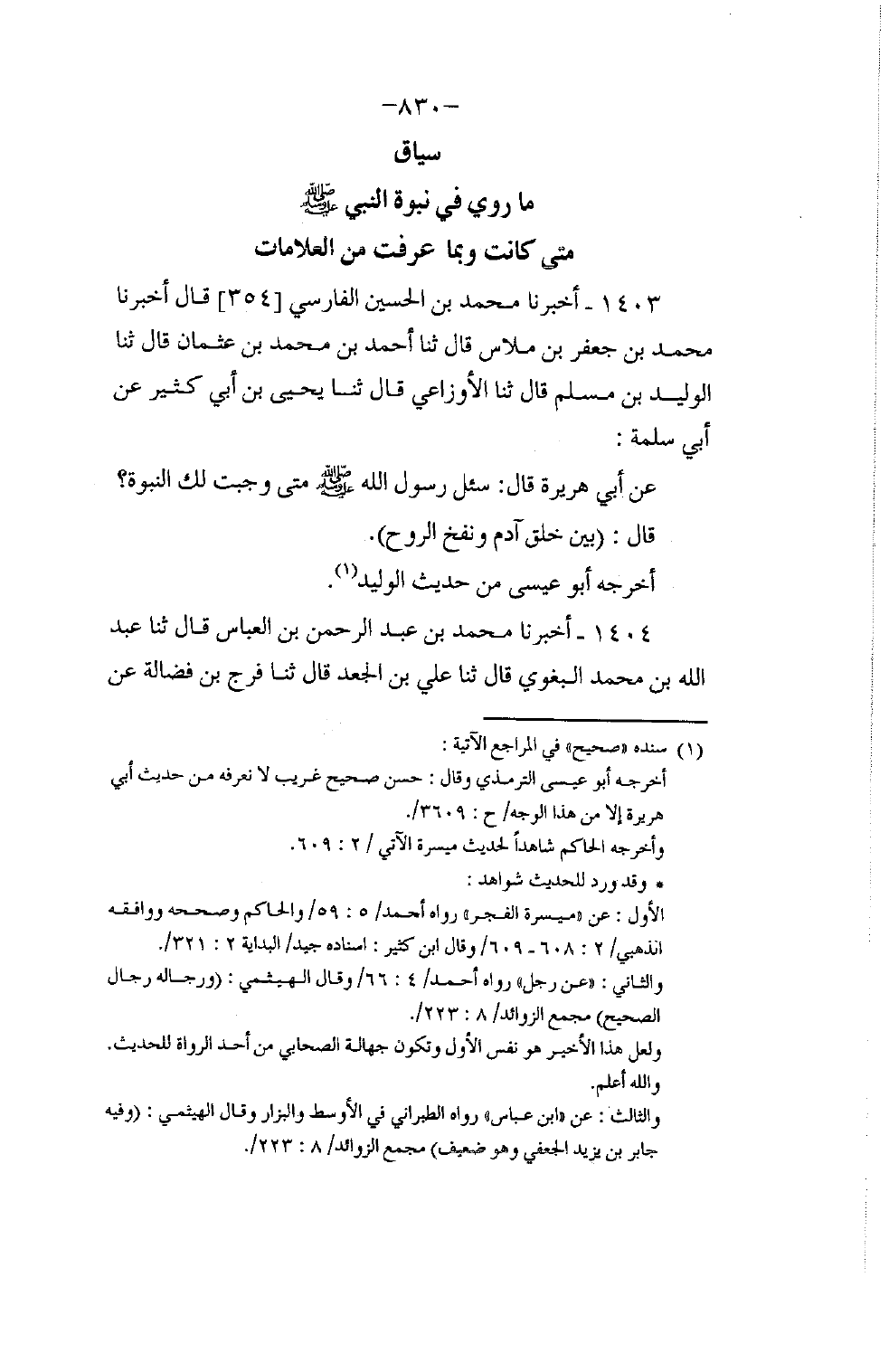 1403 - أَخْبَرَنَا مُحَمَّدُ بْنُ الْحُسَيْنِ الْفَارِسِيُّ، قَالَ: أَخْبَرَنَا مُحَمَّدُ بْنُ جَعْفَرِ بْنِ مِلَاسٍ، قَالَ: ثنا أَحْمَدُ بْنُ مُحَمَّدِ بْنِ عُثْمَانَ، قَالَ: ثنا الْوَلِيدُ بْنُ مُسْلِمٍ، قَالَ: ثنا الْأَوْزَاعِيُّ، قَالَ: ثنا يَحْيَى بْنُ أَبِي كَثِيرٍ، عَنْ أَبِي سَلَمَةَ، عَنْ أَبِي هُرَيْرَةَ، قَالَ: سُئِلَ رَسُولُ اللَّهِ صَلَّى اللهُ عَلَيْهِ وَسَلَّمَ: §مَتَى وَجَبَتْ لَكَ النُّبُوَّةُ؟ قَالَ: «بَيْنَ خَلْقِ آدَمَ وَنَفْخِ الرُّوحِ فِيهِ» أَخْرَجَهُ أَبُو عِيسَى مِنْ حَدِيثِ الْوَلِيدِ