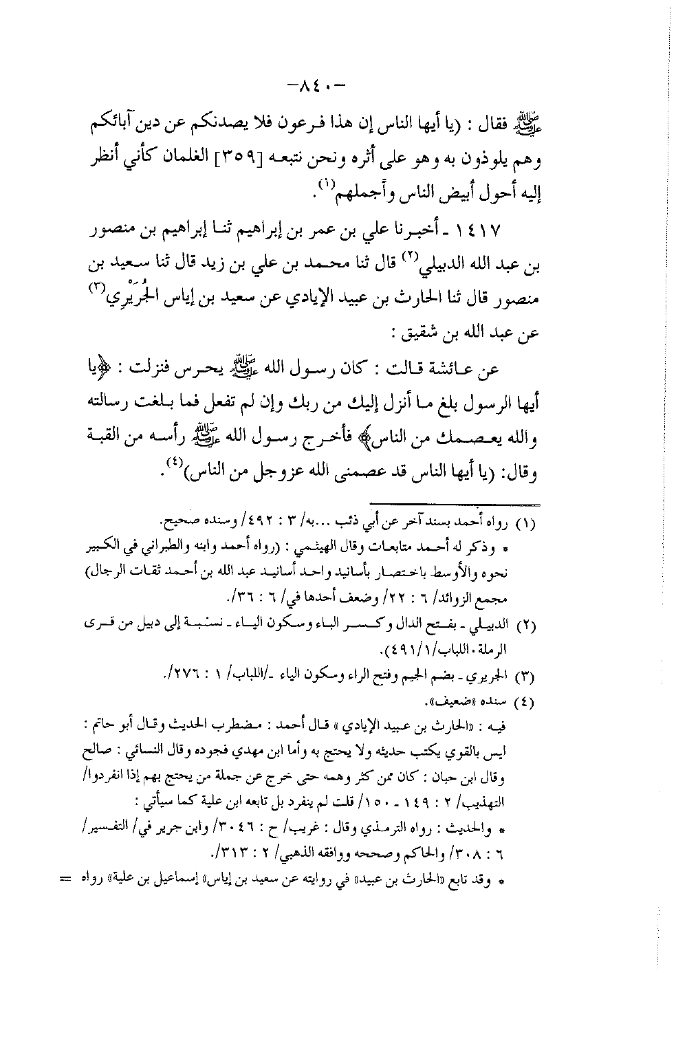 1417 - أَخْبَرَنَا عَلِيُّ بْنُ عُمَرَ بْنِ إِبْرَاهِيمَ، ثنا إِبْرَاهِيمُ بْنُ مُحَمَّدِ بْنِ عَبْدِ اللَّهِ الدُّبَيْلِيُّ، قَالَ: ثنا مُحَمَّدُ بْنُ عَلِيِّ بْنِ زَيْدٍ، قَالَ: ثنا سَعِيدُ بْنُ مَنْصُورٍ، قَالَ: ثنا الْحَارِثُ بْنُ عُبَيْدٍ الْإِيَادِيُّ، عَنْ سَعِيدِ بْنِ إِيَاسٍ الْجُرَيْرِيِّ، عَنْ عَبْدِ اللَّهِ بْنِ شَقِيقٍ، عَنْ عَائِشَةَ، قَالَتْ: كَانَ رَسُولُ اللَّهِ صَلَّى اللهُ عَلَيْهِ وَسَلَّمَ يَحْرُسُ فَنَزَلَتْ {يَأَيُّهَا الرَّسُولُ بَلِّغْ مَا أُنْزِلَ إِلَيْكَ مِنْ رَبِّكَ وَإِنْ لَمْ تَفْعَلْ فَمَا بَلَّغْتَ رِسَالَتَهُ وَاللَّهُ يَعْصِمُكَ مِنَ النَّاسِ} فَأَخْرَجَ رَسُولُ اللَّهِ صَلَّى اللهُ عَلَيْهِ وَسَلَّمَ رَأْسَهُ مِنَ الْقُبَّةِ وَقَالَ: §«يَا أَيُّهَا النَّاسُ قَدْ عَصَمَنِي اللَّهُ عَزَّ وَجَلَّ مِنَ النَّاسِ»