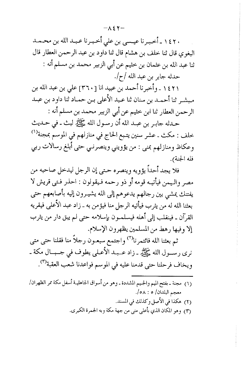 1421 - وَأَخْبَرَنَا أَحْمَدُ بْنُ عُبَيْدٍ، أَنَا عَلِيُّ بْنُ عَبْدِ اللَّهِ بْنِ مُبَشِّرٍ، ثنا أَحْمَدُ بْنُ سِنَانٍ، ثنا عَبْدُ الْأَعْلَى بْنُ حَمَّادٍ، ثنا دَاوُدُ بْنُ عَبْدِ الرَّحْمَنِ الْعَطَّارُ، ثنا ابْنُ خُثَيْمٍ، عَنْ أَبِي الزُّبَيْرِ مُحَمَّدِ بْنِ مُسْلِمٍ، أَنَّهُ حَدَّثَهُ جَابِرُ بْنُ عَبْدِ اللَّهِ: أَنَّ رَسُولَ اللَّهِ صَلَّى اللهُ عَلَيْهِ وَسَلَّمَ لَبِثَ، فِي حَدِيثِ خَلَفٍ: مَكَثَ عَشْرَ سِنِينَ يَتْبَعُ الْحَاجَّ فِي مَنَازِلِهِمْ فِي الْمَوْسِمِ بِمِجَنَّةَ، وَعُكَاظٍ وَمَنَازِلِهُمْ بِمِنًى: §«مَنْ يُؤْوِينِي وَيَنْصُرُنِي حَتَّى أُبَلِّغَ رِسَالَاتِ رَبِّي فَلَهُ الْجَنَّةُ» ، فَلَا يَجِدُ أَحَدًا يُؤْوِيَهُ وَيَنْصُرُهُ حَتَّى إِنَّ الرَّجُلَ لَيَدْخُلُ صَاحِبُهُ مِنْ مِصْرَ وَالْيَمَنِ فَيَأْتِيهِ قَوْمُهُ، أَوْ ذُو رَحِمِهِ فَيَقُولُونَ: احْذَرْ فَتَى قُرَيْشٍ لَا يَفْتِنْكَ يَمْشِي بَيْنَ رِجَالِهِمْ يَدْعُوهُمْ إِلَى اللَّهِ، يُشِيرُونَ إِلَيْهِ بِأَصَابِعِهِمْ حَتَّى بَعَثَنَا اللَّهُ لَهُ مِنْ يَثْرِبَ فَيَأْتِيهِ الرَّجُلُ مِنَّا فَيُؤْمِنُ بِهِ، زَادَ عَبْدُ الْأَعْلَى: فَيُقْرِيهِ الْقُرْآنَ، فَيَنْقَلِبُ إِلَى أَهْلِهِ فَيُسْلِمُونَ بِإِسْلَامِهِ حَتَّى لَمْ يَبْقَ دَارٌ مِنْ دُورِ يَثْرِبَ إِلَّا وَفِيهَا رَهْطٌ مِنَ الْمُسْلِمِينَ يُظْهِرُونَ الْإِسْلَامَ، ثُمَّ بَعَثَنَا اللَّهُ فَائْتَمَرْنَا وَاجْتَمَعَ سَبْعُونَ رَجُلًا مِنَّا، فَقُلْنَا: حَتَّى مَتَى نَرَى رَسُولَ اللَّهِ صَلَّى اللهُ عَلَيْهِ وَسَلَّمَ، زَادَ عَبْدُ الْأَعْلَى: يَطُوفُ فِي جِبَالِ مَكَّةَ وَيَخَافُ، فَرَحَلْنَا حَتَّى قَدِمْنَا عَلَيْهِ فِي الْمَوْسِمِ فَوَاعَدَنَا شِعْبَ الْعَقَبَةِ -[843]- فَاجْتَمَعْنَا فِيهِ مِنْ رَجُلٍ وَرَجُلَيْنِ حَتَّى تَوَافَيْنَا عِنْدَهُ، فَقُلْنَا: يَا رَسُولَ اللَّهِ، عَلَامَ نُبَايِعُكَ؟ قَالَ: «تُبَايِعُونِي عَلَى السَّمْعِ وَالطَّاعَةِ فِي النَّشَاطِ، وَالْكَسَلِ وَعَلَى النَّفَقَةِ فِي الْعُسْرِ، وَالْيُسْرِ وَعَلَى الْأَمْرِ بِالْمَعْرُوفِ، وَالنَّهْيِ عَنِ الْمُنْكَرِ، وَعَلَى أَنْ تَقُولُوا فِي اللَّهِ لَا تَأْخُذَكُمْ فِيهِ لَوْمَةُ لَائِمٍ، وَعَلَى أَنْ تَنْصُرُونِي إِذَا قَدِمْتُ عَلَيْكُمْ يَثْرِبَ، وَتَمْنَعُونِي مِمَّا تَمْنَعُونَ مِنْهُ أَنْفُسَكُمْ، وَأَزْوَاجَكُمْ وَأَبْنَاءَكُمْ، وَلَكُمُ الْجَنَّةُ» فَقُمْنَا نُبَايِعُهُ، وَأَخَذَ بِيَدِهِ أَسْعَدُ بْنُ زُرَارَةَ وَهُوَ أَصْغَرُ السَّبْعِينَ رَجُلًا إِلَّا أَنَا، فَقَالَ: رُوَيْدًا يَا أَهْلَ يَثْرِبَ، إِنَّهُ لَمْ تُضْرَبْ إِلَيْهِ أَكْبَادُ الْمَطِيِّ إِلَّا وَنَحْنُ نَعْلَمُ أَنَّهُ رَسُولُ اللَّهِ صَلَّى اللهُ عَلَيْهِ وَسَلَّمَ عِنْدَ إِخْرَاجِهِ الْيَوْمَ مُفَارَقَةُ الْعَرَبِ كَافَّةً، وَقَتْلُ خِيَارِكُمْ وَأَنْ تَعَضَّكُمُ السُّيُوفُ، فَإِمَّا أَنْتُمْ تَصْبِرُونَ عَلَى عَضِّ السُّيُوفِ إِذَا مَسَّتْكُمْ، وَعَلَى قَتْلِ خِيَارِكُمْ، وَعَلَى مُفَارَقَةِ الْعَرَبِ كَافَّةً فَخُذُوهُ، وَأَجْرُكُمْ عَلَى اللَّهِ، وَفِي حَدِيثِ عَبْدِ الْأَعْلَى أَجْرُكُمْ عَلَى اللَّهِ، وَإِمَّا أَنْتُمْ تَخَافُونَ أَنْفُسَكُمْ خِيفَةً فَذَرُوهُ فَهُوَ عُذْرٌ لَكُمْ عِنْدَ اللَّهِ، قَالُوا: أَمِطْ عَنَّا يَدَكَ يَا سَعْدُ بْنَ زُرَارَةَ، فَوَاللَّهِ لَا نَذَرُ هَذِهِ الْبَيْعَةَ، وَلَا نَسْتَقِيلُهَا، فَقُمْنَا إِلَيْهِ نُبَايِعُهُ رَجُلًا فَرَجُلًا فَيَأْخُذُ عَلَيْنَا شَرْطَهُ وَيُعْطِينَا عَلَى ذَلِكَ الْجَنَّةَ