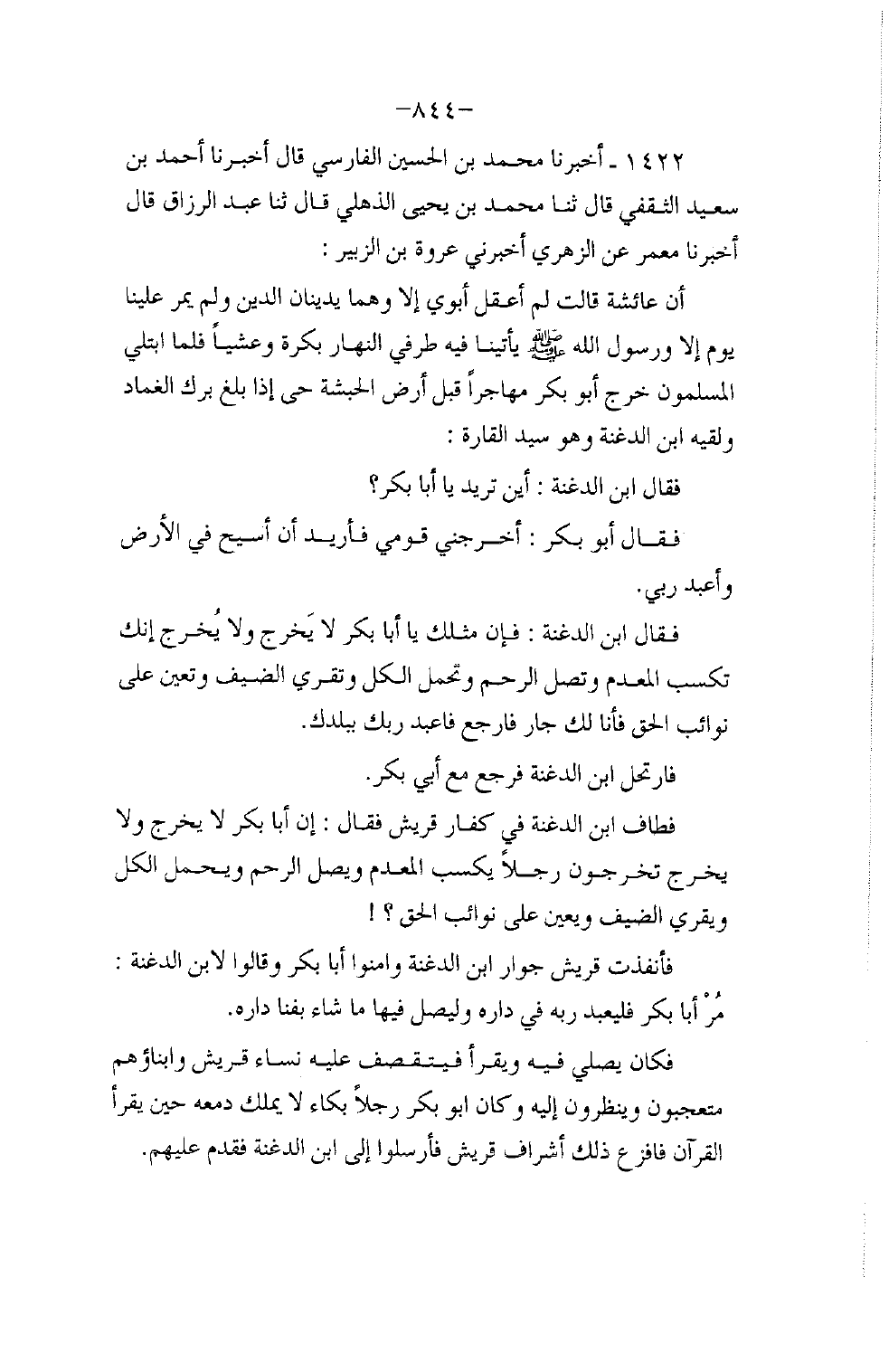 1422 - أَخْبَرَنَا مُحَمَّدُ بْنُ الْحُسَيْنِ الْفَارِسِيُّ، قَالَ: أَخْبَرَنَا أَحْمَدُ بْنُ سَعِيدٍ الثَّقَفِيُّ، قَالَ: ثنا مُحَمَّدُ بْنُ يَحْيَى الذُّهْلِيُّ، قَالَ: ثنا عَبْدُ الرَّزَّاقِ، قَالَ: أَخْبَرَنَا مَعْمَرٌ، عَنِ الزُّهْرِيِّ، أَخْبَرَنِي عُرْوَةُ بْنُ الزُّبَيْرِ: أَنَّ عَائِشَةَ قَالَتْ: " لَمْ أَعْقِلْ أَبَوَيَّ إِلَّا وَهُمَا يَدِينَانِ الدِّينَ، وَلَمْ يَمُرَّ عَلَيْنَا يَوْمٌ إِلَّا وَرَسُولُ اللَّهِ صَلَّى اللهُ عَلَيْهِ وَسَلَّمَ يَأْتِينَا فِيهِ طَرَفَيِ النَّهَارِ بُكْرَةً، وَعَشِيًّا، فَلَمَّا ابْتُلِيَ الْمُسْلِمُونَ خَرَجَ أَبُو بَكْرٍ مُهَاجِرًا قِبَلَ أَرْضِ الْحَبَشَةِ حَتَّى إِذَا بَلَغَ بَرْكَ الْغَمَادِ وَلَقِيَهُ ابْنُ الدُّغُنَّةَ وَهُوَ سَيِّدُ الْقَارَةِ §فَقَالَ ابْنُ الدُّغُنَّةَ: أَيْنَ تُرِيدُ يَا أَبَا بَكْرٍ؟ فَقَالَ أَبُو بَكْرٍ: أَخْرَجَنِي قَوْمِي فَأُرِيدُ أَنْ أَسِيحَ فِي الْأَرْضِ وَأَعْبُدَ رَبِّي، فَقَالَ ابْنُ الدُّغُنَّةِ: فَإِنَّ مِثْلَكَ يَا أَبَا بَكْرِ لَا يَخْرُجُ وَلَا يُخْرَجُ؛ إِنَّكَ تُكْسِبُ الْمُعْدِمَ، وَتَصِلُ الرَّحِمَ، وَتَحْمِلُ الْكَلَّ، وَتُقْرِي الضَّيْفَ، وَتُعِينُ عَلَى نَوَائِبِ الْحَقِّ، فَأَنَا لَكَ جَارٌ، فَارْجِعْ فَاعْبُدْ رَبَّكَ بِبَلَدِكَ فَارْتَحَلَ ابْنُ الدُّغُنَّةِ فَرَجَعَ مَعَ أَبِي بَكْرٍ، فَطَافَ ابْنُ الدُّغُنَّةِ فِي كُفَّارِ قُرَيْشٍ فَقَالَ: إِنَّ أَبَا بَكْرٍ لَا يَخْرُجُ وَلَا يُخْرَجُ، تُخْرِجُونَ رَجُلًا يُكْسِبُ الْمُعْدِمَ، وَيَصِلُ الرَّحِمَ، وَيَحْمِلُ الْكَلَّ، وَيُقْرِي الضَّيْفَ وَيُعِينُ عَلَى نَوَائِبِ الْحَقِّ فَأَنْفَذَتْ قُرَيْشٌ جِوَارَ ابْنِ الدُّغُنَّةِ وَأَمَّنُوا أَبَا بَكْرٍ، وَقَالُوا لِابْنِ الدُّغُنَّةِ: مُرْ أَبَا بَكْرٍ فَلْيَعْبُدْ رَبَّهُ فِي دَارِهِ، وَلْيُصَلِّ فِيهَا مَا شَاءَ بِفِنَاءِ دَارِهِ، فَكَانَ يُصَلِّي فِيهِ وَيَقْرَأُ فَيَتَقَصَّفُ عَلَيْهِ نِسَاءُ قُرَيْشٍ وَأَبْنَاؤُهُمْ مُتَعَجِّبُونَ، وَيَنْظُرُونَ إِلَيْهِ، وَكَانَ أَبُو بَكْرٍ رَجُلًا بَكَّاءً لَا يَمْلِكُ دَمْعَهُ حِينَ يَقْرَأُ الْقُرْآنَ فَأَفْزَعَ ذَلِكَ أَشْرَافُ قُرَيْشٍ فَأَرْسَلُوا إِلَى ابْنِ الدُّغُنَّةِ فَقَدِمَ عَلَيْهِمْ -[845]-، فَقَالُوا: إِنَّمَا أَجَرْنَا أَبَا بَكْرٍ عَلَى أَنْ يَعْبُدَ رَبَّهُ فِي دَارِهِ، وَإِنَّهُ قَدْ جَاوَزَ ذَلِكَ وَابْتَنَى مَسْجِدًا بِفِنَاءِ دَارِهِ، وَأَعْلَى الصَّلَاةَ وَالْقُرْآنَ، وَإِنَّا قَدْ خَشِينَا أَنْ يَفْتِنَ نِسَاءَنَا وَأَبْنَاءَنَا، فَإِنَّهُ إِنْ أَحَبَّ أَنْ يَقْتَصِرَ عَلَى أَنْ يَعْبُدَ رَبَّهُ فِي دَارِهِ فَعَلَ، وَإِنْ أَبَى إِلَّا أَنْ يُعْلِنَ بِذَلِكَ فَتَسْأَلَهُ أَنْ يَرُدَّ عَلَيْكَ ذِمَّتَكَ فَإِنَّا كَرِهْنَا أَنْ نُخْفِرَكَ، وَلَسْنَا مُقِرِّينَ لِأَبِي بَكْرٍ الِاسْتِعْلَانَ " قَالَتْ عَائِشَةُ: " فَأَتَى أَبَا بَكْرٍ ابْنُ الدُّغُنَّةِ فَقَالَ: يَا أَبَا بَكْرٍ، قَدْ عَلِمْتَ الَّذِي عَقَدْتُ لَكَ عَلَيْهِ، فَإِمَّا أَنْ تَقْتَصِرَ عَلَى ذَلِكَ، وَإِمَّا أَنْ تُرْجِعَ إِلَيَّ ذِمَّتِي؛ فَإِنِّي لَا أُحِبُّ أَنْ تَسْمَعَ الْعَرَبُ أَنِّي أُخْفِرْتُ فِي عَقْدِ رَجُلٍ عَقَدْتُ لَهُ، فَقَالَ أَبُو بَكْرٍ: فَإِنِّي أَرُدُّ إِلَيْكَ جِوَارَكَ وَأَرْضَى بِجِوَارِ اللَّهِ وَرَسُولِهِ، وَرَسُولُ اللَّهِ يَوْمَئِذٍ بِمَكَّةَ " أَخْرَجَهُ الْبُخَارِيُّ وَمُسْلِمٌ