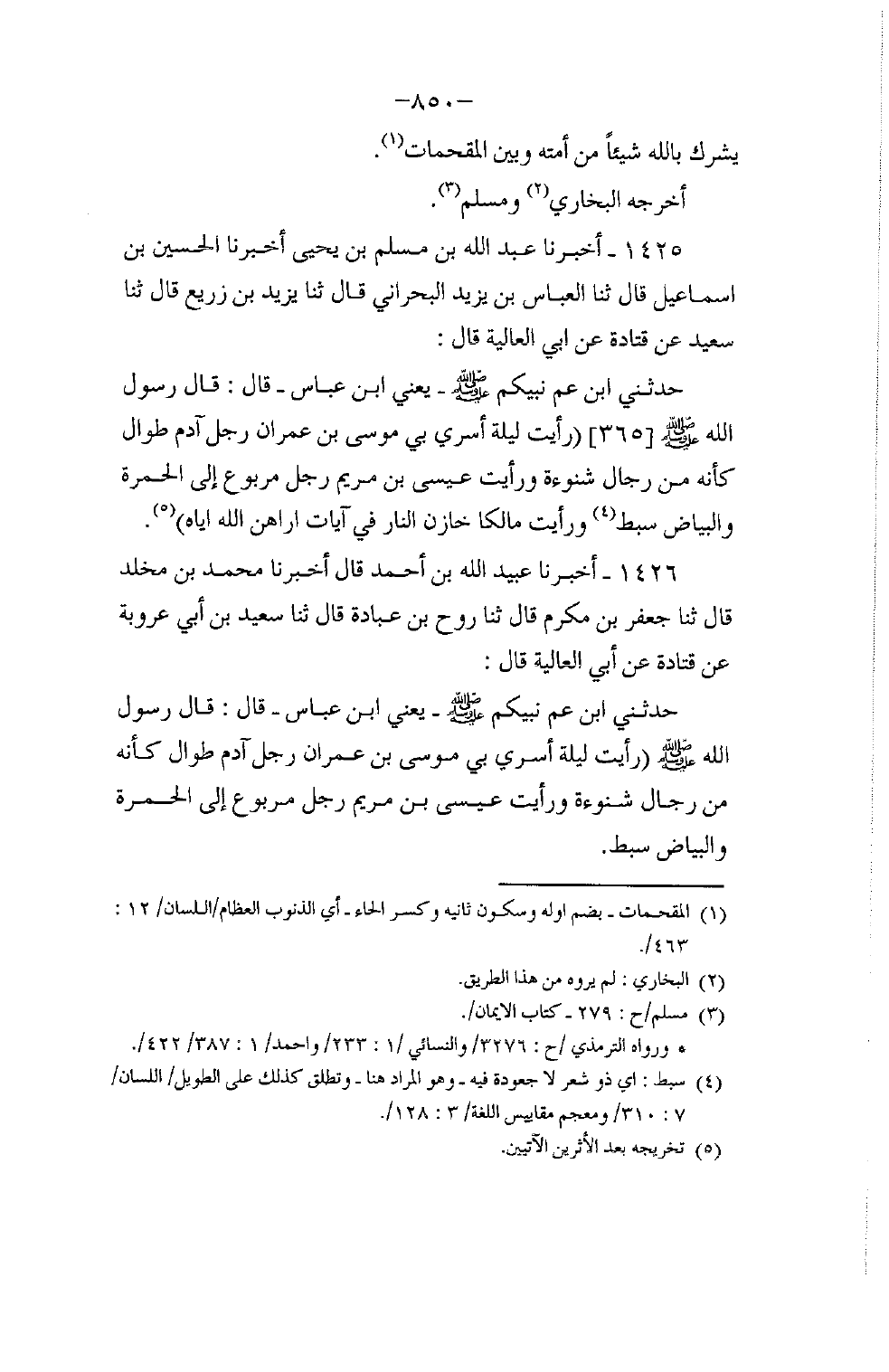1425 - أَخْبَرَنَا عَبْدُ اللَّهِ بْنُ مُسْلِمِ بْنِ يَحْيَى، أَخْبَرَنَا الْحُسَيْنُ بْنُ إِسْمَاعِيلَ، قَالَ: ثنا الْعَبَّاسُ بْنُ يَزِيدَ الْبَحْرَانِيُّ، قَالَ: ثنا يَزِيدُ بْنُ زُرَيْعٍ، قَالَ: ثنا سَعِيدٌ، عَنْ قَتَادَةَ، عَنْ أَبِي الْعَالِيَةِ، قَالَ: حَدَّثَنِي ابْنُ عَمِّ نَبِيِّكُمْ صَلَّى اللهُ عَلَيْهِ وَسَلَّمَ، يَعْنِي ابْنَ عَبَّاسٍ قَالَ: قَالَ رَسُولُ اللَّهِ صَلَّى اللهُ عَلَيْهِ وَسَلَّمَ: «§رَأَيْتُ لَيْلَةَ أُسْرِيَ بِي مُوسَى بْنَ عِمْرَانَ، رَجُلٌ آدَمُ طُوَالٌ كَأَنَّهُ مِنْ رِجَالِ شَنُوءَةَ، وَرَأَيْتُ عِيسَى ابْنَ مَرْيَمَ رَجُلٌ مَرْبُوعٌ إِلَى الْحُمْرَةِ وَالْبَيَاضِ سَبِطٌ، وَرَأَيْتُ مَالِكًا خَازِنَ النَّارِ فِي آيَاتٍ أَرَاهُنَّ اللَّهُ إِيَّاهُ»