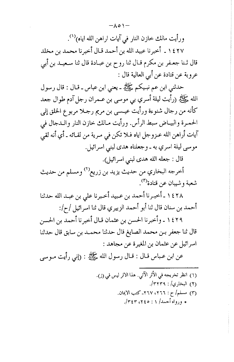 1427 - أَخْبَرَنَا عُبَيْدُ اللَّهِ بْنُ أَحْمَدَ، قَالَ: أَخْبَرَنَا مُحَمَّدُ بْنُ مَخْلَدٍ، قَالَ: ثنا جَعْفَرُ بْنُ مُكْرَمٍ، قَالَ: ثنا رَوْحُ بْنُ عُبَادَةَ، قَالَ: ثنا سَعِيدُ بْنُ أَبِي عَرُوبَةَ، عَنْ قَتَادَةَ، عَنْ أَبِي الْعَالِيَةِ، قَالَ: حَدَّثَنِي ابْنُ عَمِّ نَبِيِّكُمْ صَلَّى اللهُ عَلَيْهِ وَسَلَّمَ يَعْنِي ابْنَ عَبَّاسٍ قَالَ: قَالَ رَسُولُ اللَّهِ صَلَّى اللهُ عَلَيْهِ وَسَلَّمَ: §«رَأَيْتُ لَيْلَةَ أُسْرِيَ بِي مُوسَى آدَمُ طُوَالٌ جَعْدٌ كَأَنَّهُ مِنْ رِجَالِ شَنُوءَةَ، وَرَأَيْتُ عِيسَى رَجُلٌ مَرْبُوعُ الْخَلْقِ إِلَى الْحُمْرَةِ وَالْبَيَاضِ سَبْطُ الرَّأْسِ، وَرَأَيْتُ مَالِكًا خَازِنَ النَّارِ، وَالدَّجَّالَ فِي آيَاتٍ أَرَاهُنَّ اللَّهُ عَزَّ وَجَلَّ إِيَّاهُ فَلَا يَكُنْ فِي مِرْيَةٍ مِنْ لِقَائِهِ» أَيْ أَنَّهُ لَقِيَ مُوسَى لَيْلَةَ أُسْرِيَ بِهِ {وَجَعَلْنَاهُ هُدًى لِبَنِي إِسْرَائِيلَ} [الإسراء: 2] قَالَ: «جَعَلَهُ اللَّهُ هُدًى لِبَنِي إِسْرَائِيلَ» أَخْرَجَهُ الْبُخَارِيُّ مِنْ حَدِيثِ يَزِيدَ بْنِ زُرَيْعٍ، وَمُسْلِمٌ مِنْ حَدِيثِ شُعْبَةَ، وَشَيْبَانَ عَنْ قَتَادَةَ