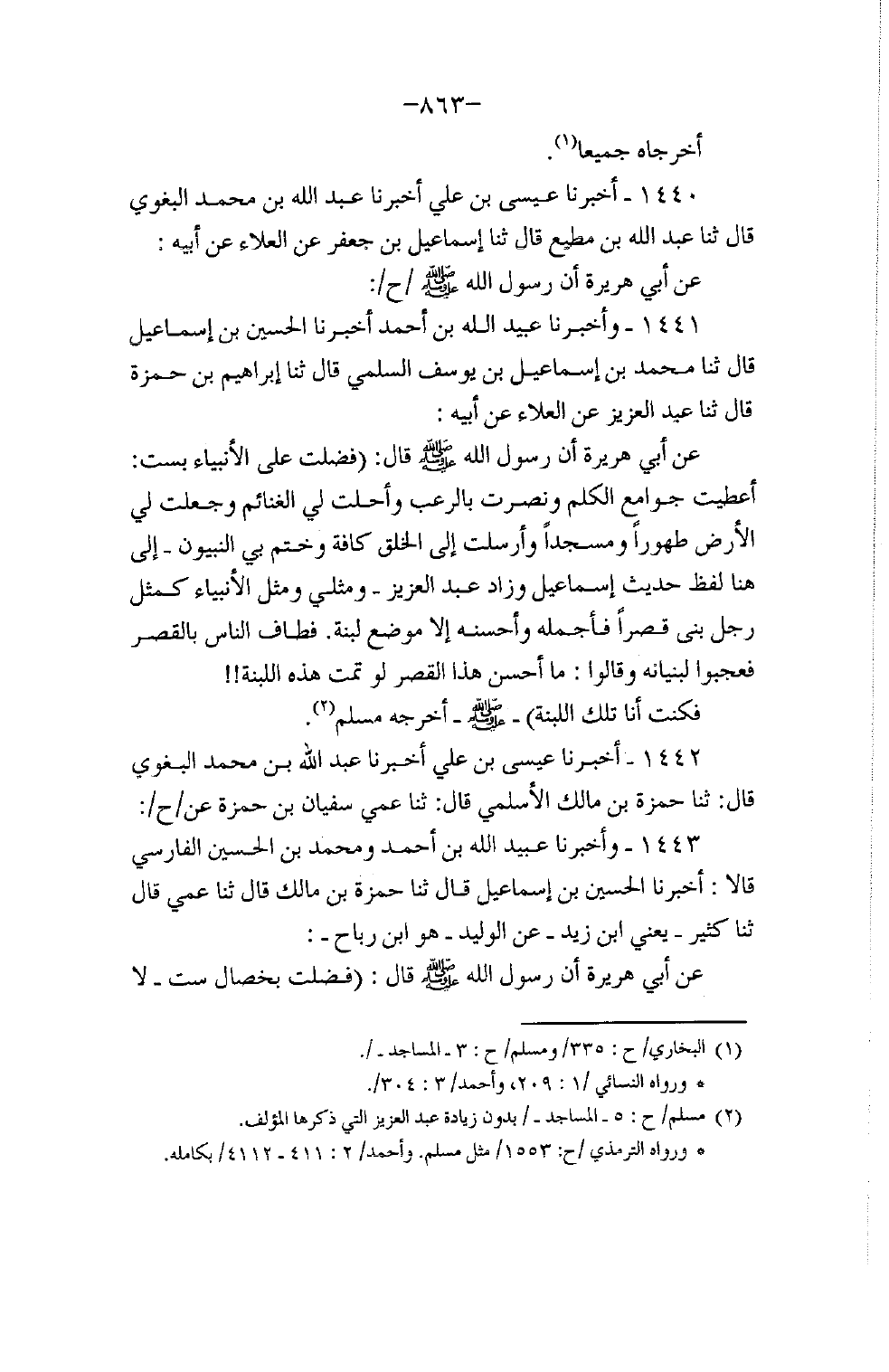 1441 - وَأَخْبَرَنَا عُبَيْدُ اللَّهِ بْنُ أَحْمَدَ، أَخْبَرَنَا الْحُسَيْنُ بْنُ إِسْمَاعِيلَ، قَالَ: ثنا مُحَمَّدُ بْنُ إِسْمَاعِيلَ بْنِ يُوسُفَ السُّلَمِيُّ، قَالَ: ثنا إِبْرَاهِيمُ بْنُ حَمْزَةَ، قَالَ: ثنا عَبْدُ الْعَزِيزِ، عَنِ الْعَلَاءِ، عَنْ أَبِيهِ، عَنْ أَبِي هُرَيْرَةَ أَنَّ رَسُولَ اللَّهِ صَلَّى اللهُ عَلَيْهِ وَسَلَّمَ قَالَ: " §فُضِّلْتُ عَلَى الْأَنْبِيَاءِ بِسِتٍّ: أُعْطِيتُ جَوَامِعَ الْكَلِمِ، وَنُصِرْتُ بِالرُّعْبِ، وَأُحِلَّتْ لِيَ الْغَنَائِمُ، وَجُعِلَتْ لِيَ الْأَرْضُ طَهُورًا وَمَسْجِدًا، وَأُرْسِلْتُ إِلَى الْخَلْقِ كَافَّةً، وَخُتِمَ بِيَ النَّبِيُّونَ «إِلَى هُنَا لَفْظُ حَدِيثِ إِسْمَاعِيلَ، وَزَادَ عَبْدُ الْعَزِيزِ» وَمَثَلِي وَمَثَلُ الْأَنْبِيَاءِ كَمَثَلِ رَجُلٍ بَنَى قَصْرًا فَأَجْمَلَهُ وَأَحْسَنَهُ إِلَّا مَوْضِعَ لَبِنَةٍ، فَطَافَ النَّاسُ بِالْقَصْرِ فَعَجِبُوا لِبُنْيَانِهِ وَقَالُوا: مَا أَحْسَنَ هَذَا الْقَصْرَ لَوْ تَمَّتْ هَذِهِ اللَّبِنَةُ، فَكُنْتُ أَنَا تِلْكَ اللَّبِنَةَ ". صَلَّى اللهُ عَلَيْهِ وَسَلَّمَ أَخْرَجَهُ مُسْلِمٌ