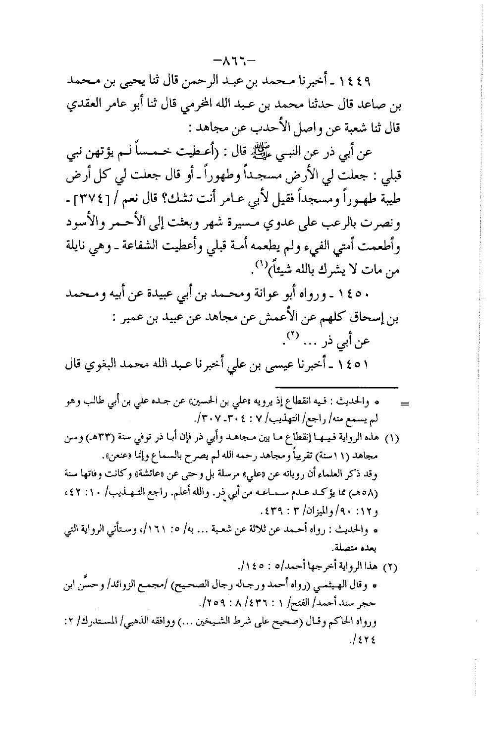 1449 - أَخْبَرَنَا مُحَمَّدُ بْنُ عَبْدِ الرَّحْمَنِ، قَالَ: ثنا يَحْيَى بْنُ مُحَمَّدِ بْنِ صَاعِدٍ، قَالَ: حَدَّثَنَا مُحَمَّدُ بْنُ عَبْدِ اللَّهِ الْمُخَرَّمِيُّ، قَالَ: ثنا أَبُو عَامِرٍ الْعَقَدِيُّ، قَالَ: ثنا شُعْبَةُ، عَنْ وَاصِلٍ الْأَحْدَبِ، عَنْ مُجَاهِدٍ، عَنْ أَبِي ذَرٍّ، عَنِ النَّبِيِّ صَلَّى اللهُ عَلَيْهِ وَسَلَّمَ قَالَ: " §أُعْطِيتُ خَمْسًا لَمْ يُؤْتَهُنَّ نَبِيٌّ قَبْلِي: جُعِلَتْ لِيَ الْأَرْضُ مَسْجِدًا وَطَهُورًا " أَوْ قَالَ: «جُعِلَتْ لِيَ كُلُّ أَرْضٍ طَيِّبَةٍ طَهُورًا وَمَسْجِدًا» فَقِيلَ لِأَبِي عَامِرٍ: أَنْتَ تَشُكُّ؟ قَالَ: نَعَمْ، «وَنُصِرْتُ بِالرُّعْبِ عَلَى عَدُوِّي مَسِيرَةَ شَهْرٍ، وَبُعِثْتُ إِلَى الْأَحْمَرِ وَالْأَسْوَدِ، وَأُطْعِمَتْ أُمَّتِي الْفَيْءَ، وَلَمْ يُطْعِمْهُ أُمَّةً قَبْلِي، وَأُعْطِيتُ الشَّفَاعَةَ وَهِيَ نَايِلَةٌ مَنْ مَاتَ لَا يُشْرِكُ بِاللَّهِ شَيْئًا»