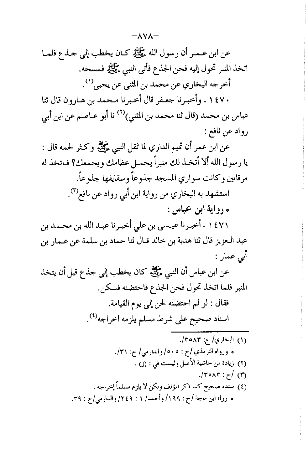 1471 - أَخْبَرَنَا عِيسَى بْنُ عَلِيٍّ، أَخْبَرَنَا عَبْدُ اللَّهِ بْنُ مُحَمَّدِ بْنِ عَبْدِ الْعَزِيزِ، قَالَ: ثنا هُدْبَةُ بْنُ خَالِدٍ، قَالَ: ثنا حَمَّادُ بْنُ سَلَمَةَ، عَنْ عَمَّارِ بْنِ أَبِي عَمَّارٍ، عَنِ ابْنِ عَبَّاسٍ أَنَّ النَّبِيَّ صَلَّى اللهُ عَلَيْهِ وَسَلَّمَ كَانَ يَخْطُبُ إِلَى جِذْعٍ قَبْلَ أَنْ يَتَّخِذَ الْمِنْبَرَ، فَلَمَّا اتَّخَذَ تَحَوَّلَ فَحَنَّ الْجِذْعُ، فَاحْتَضَنَهُ فَسَكَنَ فَقَالَ: §«لَوْ لَمْ أَحْتَضِنْهُ لَحَنَّ إِلَى يَوْمِ الْقِيَامَةِ» إِسْنَادٌ صَحِيحٌ عَلَى شَرْطِ مُسْلِمٍ يَلْزَمُهُ إِخْرَاجُهُ