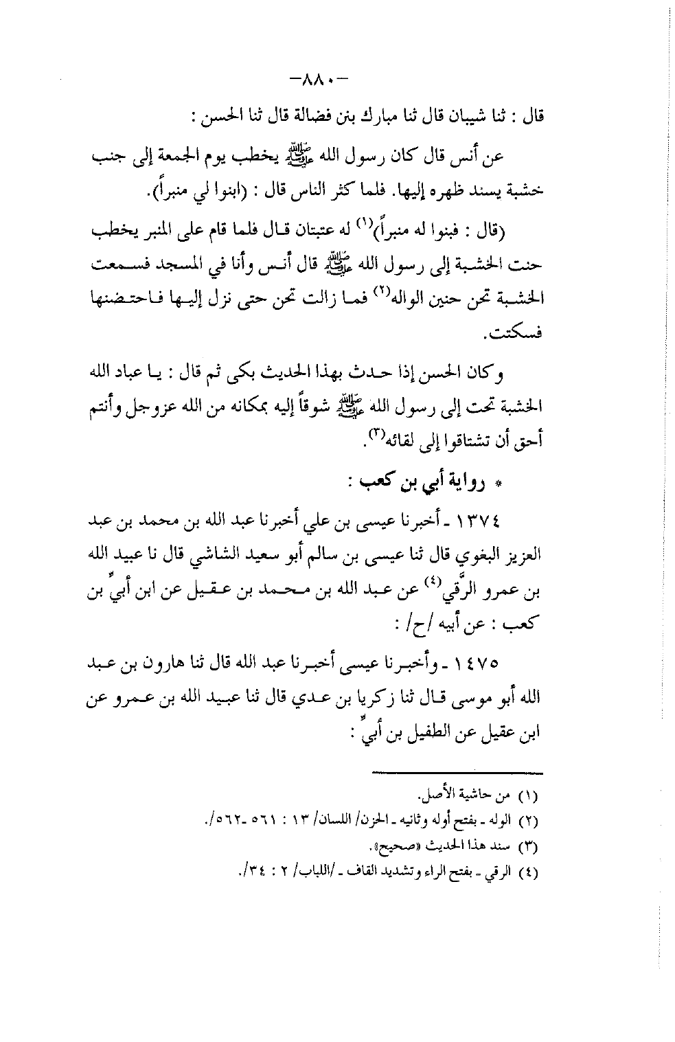 1475 - وَأَخْبَرَنَا عِيسَى، أَخْبَرَنَا عَبْدُ اللَّهِ، قَالَ: ثنا هَارُونُ بْنُ عَبْدِ اللَّهِ أَبُو مُوسَى، قَالَ: ثنا زَكَرِيَّا بْنُ عَدِيٍّ، قَالَ: ثنا عُبَيْدُ اللَّهِ بْنُ عَمْرٍو، عَنِ ابْنِ عَقِيلٍ، عَنِ الطُّفَيْلِ بْنِ أُبَيٍّ -[881]-، عَنْ أَبِيهِ، قَالَ: كَانَ رَسُولُ اللَّهِ صَلَّى اللهُ عَلَيْهِ وَسَلَّمَ يُصَلِّي إِلَى جِذْعٍ إِذْ كَانَ فِي الْمَسْجِدِ عَرِيشًا وَكَانَ يَخْطُبُ إِلَيْهِ، فَقَالَ لَهُ رَجُلٌ مِنْ أَصْحَابِهِ: §هَلْ لَكَ أَنْ نَجْعَلَ لَكَ عَرِيشًا تَقُومُ عَلَيْهِ يَوْمَ الْجُمُعَةِ حَتَّى يَرَاكَ النَّاسُ وَيَسْمَعُوا خُطْبَتَكَ؟ قَالَ: «نَعَمْ» فَصَنَعُوا لَهُ ثَلَاثَ دَرَجَاتٍ هِيَ الَّتِي عَلَى الْمِنْبَرِ أَعْلَى الْمِنْبَرِ، فَلَمَّا صُنِعَ الْمِنْبَرُ، وَوُضِعَ فِي مَوْضِعِهِ الَّذِي وَضَعَهُ رَسُولُ اللَّهِ صَلَّى اللهُ عَلَيْهِ وَسَلَّمَ، فَلَمَّا أَرَادَ أَنْ يَأْتِيَ الْمِنْبَرَ مَرَّ عَلَيْهِ فَلَمَّا جَاوَزَهُ حَنَّ الْجِذْعُ حَتَّى سَقَطَ وَانْشَقَّ فَرَجَعَ رَسُولُ اللَّهِ صَلَّى اللهُ عَلَيْهِ وَسَلَّمَ، فَمَسَحَهُ بِيَدِهِ حَتَّى سَكَنَ، ثُمَّ رَجَعَ، وَكَانَ إِذَا صَلَّى صَلَّى إِلَيْهَا فَلَمَّا هُدِمَ الْمَسْجِدُ وَغُيِّرَ أَخَذَ ذَلِكَ الْجِذْعَ أُبَيُّ بْنُ كَعْبٍ فَكَانَ عِنْدَهُ حَتَّى بَلِيَ وَأَكَلَتْهُ الْأَرْضُ وَعَادَ رُفَاتًا وَاللَّفْظُ لِحَدِيثِ هَارُونَ
