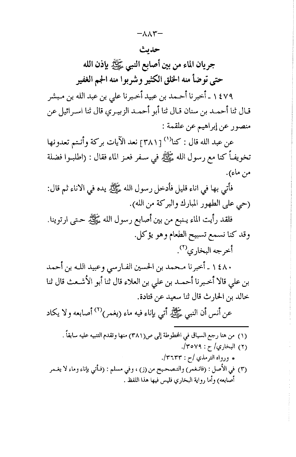 1479 - أَخْبَرَنَا أَحْمَدُ بْنُ عُبَيْدٍ، أَخْبَرَنَا عَلِيُّ بْنُ عَبْدِ اللَّهِ بْنِ مُبَشِّرٍ، قَالَ: ثنا أَحْمَدُ بْنُ سِنَانٍ، قَالَ: ثنا أَبُو أَحْمَدَ الزُّبَيْرِيُّ، قَالَ: ثنا إِسْرَائِيلُ، عَنْ مَنْصُورٍ، عَنْ إِبْرَاهِيمَ، عَنْ عَلْقَمَةَ، عَنْ عَبْدِ اللَّهِ، قَالَ: كُنَّا نَعُدُّ الْآيَاتِ بَرَكَةً، وَأَنْتُمْ تَعُدُّونَهَا تَخْوِيفًا كُنَّا مَعَ رَسُولِ اللَّهِ صَلَّى اللهُ عَلَيْهِ وَسَلَّمَ فِي سَفَرٍ فَعَزَّ الْمَاءُ فَقَالَ: «اطْلُبُوا فَضْلَةً مِنْ مَاءٍ» فَأُتِيَ بِهَا فِي إِنَاءٍ قَلِيلٍ فَأَدْخَلَ رَسُولُ اللَّهِ صَلَّى اللهُ عَلَيْهِ وَسَلَّمَ يَدَهُ فِي الْإِنَاءِ، ثُمَّ قَالَ: «§حَيَّ عَلَى الطَّهُورِ الْمُبَارَكِ، وَالْبَرَكَةِ مِنَ اللَّهِ» فَلَقَدْ رَأَيْتُ الْمَاءَ يَنْبُعُ مِنْ بَيْنِ أَصَابِعِ رَسُولِ اللَّهِ صَلَّى اللهُ عَلَيْهِ وَسَلَّمَ حَتَّى ارْتَوَيْنَا، وَقَدْ كُنَّا نَسْمَعُ تَسْبِيحَ الطَّعَامِ وَهُوَ يُؤْكَلُ أَخْرَجَهُ الْبُخَارِيُّ