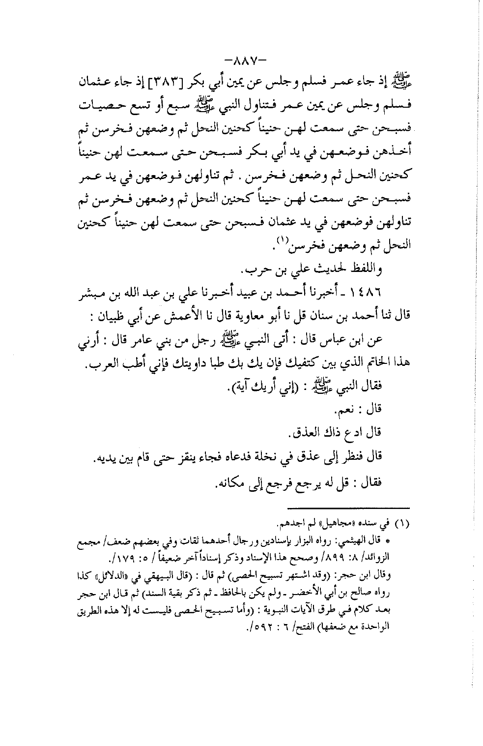 1486 - أَخْبَرَنَا أَحْمَدُ بْنُ عُبَيْدٍ، أَخْبَرَنَا عَلِيُّ بْنُ عَبْدِ اللَّهِ بْنِ مُبَشِّرٍ، قَالَ: ثنا أَحْمَدُ بْنُ سِنَانٍ، قَالَ نا أَبُو مُعَاوِيَةَ، قَالَ: نا الْأَعْمَشُ، عَنْ أَبِي ظَبْيَانَ، عَنِ ابْنِ عَبَّاسٍ، قَالَ: أَتَى النَّبِيَّ صَلَّى اللهُ عَلَيْهِ وَسَلَّمَ رَجُلٌ مِنْ بَنِي عَامِرٍ قَالَ: أَرِنِي هَذَا الْخَاتَمَ الَّذِي بَيْنَ كَتِفَيْكَ فَإِنْ يَكُ بِكَ طِبًّا دَاوَيْتُكَ فَإِنِّي أَطَبُّ الْعَرَبِ، فَقَالَ النَّبِيُّ صَلَّى اللهُ عَلَيْهِ وَسَلَّمَ: «§إِنِّي أُرِيكَ آيَةً» ، قَالَ: نَعَمْ، قَالَ: «ادْعُ ذَاكَ الْعِذْقَ» قَالَ: فَنَظَرَ إِلَى عِذْقٍ فِي نَخْلَةٍ فَدَعَاهُ فَجَاءَ يَنْقُزُ حَتَّى قَامَ بَيْنَ يَدَيْهِ، فَقَالَ: «قُلْ لَهُ يَرْجِعْ» فَرَجَعَ إِلَى مَكَانِهِ -[888]-، فَقَالَ: يَا بَنِي عَامِرٍ مَا رَأَيْتُ كَالْيَوْمِ أَسْحَرَ "