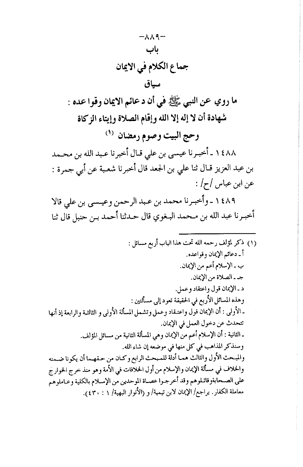 1489 - وَأَخْبَرَنَا مُحَمَّدُ بْنُ عَبْدِ الرَّحْمَنِ، وَعِيسَى بْنُ عَلِيٍّ، قَالَا: أَخْبَرَنَا عَبْدُ اللَّهِ بْنُ مُحَمَّدٍ الْبَغَوِيُّ، قَالَ: حَدَّثَنَا أَحْمَدُ بْنُ حَنْبَلٍ، قَالَ: ثنا -[890]- يَحْيَى بْنُ سَعِيدٍ، عَنْ شُعْبَةَ، قَالَ: حَدَّثَنِي أَبُو جَمْرَةَ، قَالَ: سَمِعْتُ ابْنَ عَبَّاسٍ، يَقُولُ: إِنَّ وَفْدَ عَبْدِ الْقَيْسِ لَمَّا قَدِمُوا عَلَى رَسُولِ اللَّهِ صَلَّى اللهُ عَلَيْهِ وَسَلَّمَ أَمَرَهُمْ بِالْإِيمَانِ بِاللَّهِ، فَقَالَ: «§أَتَدْرُونَ مَا الْإِيمَانُ؟» قَالُوا: اللَّهُ وَرَسُولُهُ أَعْلَمُ قَالَ: «شَهَادَةُ أَنْ لَا إِلَهَ إِلَّا اللَّهُ، وَإِقَامُ الصَّلَاةِ، وَإِيتَاءُ الزَّكَاةِ، وَصَوْمُ رَمَضَانَ، وَأَنْ تُعْطُوا الْخُمْسَ مِنَ الْمَغْنَمِ» أَخْرَجَهُ الْبُخَارِيُّ، وَمُسْلِمٌ، وَأَبُو دَاوُدَ