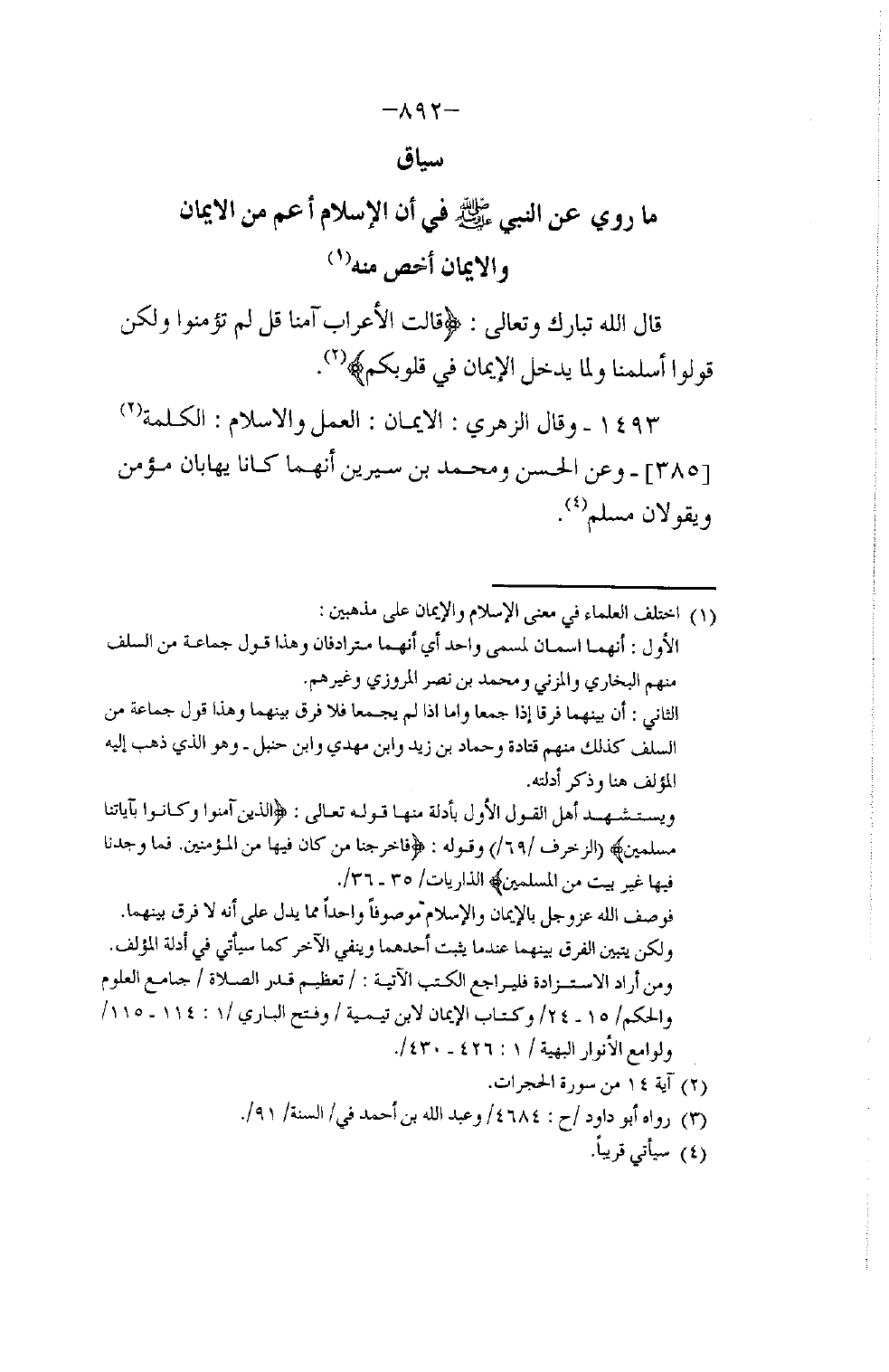 1493 - وَقَالَ الزُّهْرِيُّ: الْإِيمَانُ الْعَمَلُ، وَالْإِسْلَامُ الْكَلِمَةُ وَعَنِ الْحَسَنِ، وَمُحَمَّدِ بْنِ سِيرِينَ، أَنَّهُمَا كَانَا يَهَابَانِ: «مُؤْمِنٌ» ، وَيَقُولَانِ: «مُسْلِمٌ» -[893]- وَبِهِ قَالَ مِنَ الْفُقَهَاءِ: حَمَّادُ بْنُ زَيْدٍ، وَمُحَمَّدُ بْنُ عَبْدِ الرَّحْمَنِ بْنِ أَبِي ذِئْبٍ، وَأَحْمَدُ بْنُ حَنْبَلٍ