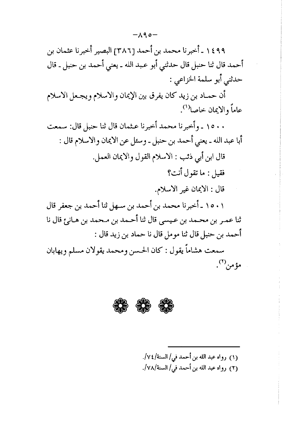 1499 - أَخْبَرَنَا مُحَمَّدُ بْنُ أَحْمَدَ الْبَصِيرُ، أَخْبَرَنَا عُثْمَانُ بْنُ أَحْمَدَ، قَالَ: ثنا حَنْبَلٌ، قَالَ: حَدَّثَنِي أَبُو عَبْدِ اللَّهِ، يَعْنِي أَحْمَدَ بْنَ حَنْبَلٍ قَالَ: حَدَّثَنِي أَبُو سَلَمَةَ الْخُزَاعِيُّ «أَنَّ حَمَّادَ بْنَ زَيْدٍ كَانَ يُفَرِّقُ بَيْنَ الْإِيمَانِ، وَالْإِسْلَامِ، وَيَجْعَلُ §الْإِسْلَامَ عَامًّا، وَالْإِيمَانَ خَاصًّا»