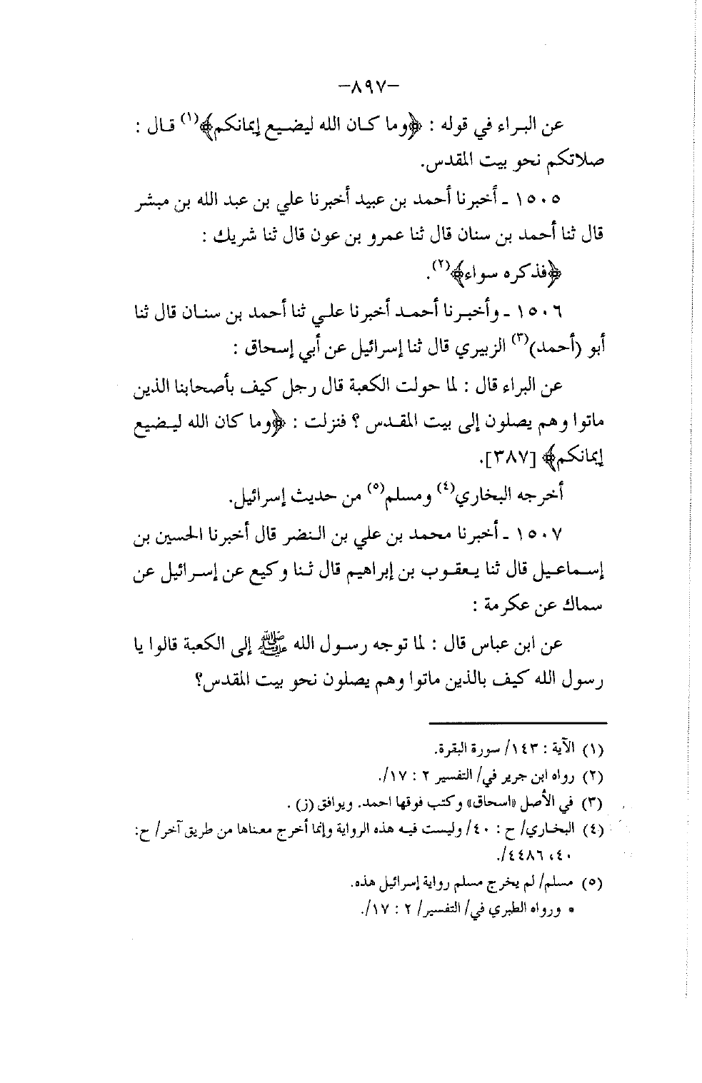 1506 - وَأَخْبَرَنَا أَحْمَدُ، أَخْبَرَنَا عَلِيٌّ، ثنا أَحْمَدُ بْنُ سِنَانٍ، قَالَ: ثنا أَبُو أَحْمَدُ الزُّبَيْرِيُّ قَالَ: ثنا إِسْرَائِيلُ، عَنْ أَبِي إِسْحَاقَ، عَنِ الْبَرَاءِ، قَالَ: " §لَمَّا حُوِّلَتِ الْكَعْبَةُ، قَالَ رَجُلٌ: كَيْفَ بِأَصْحَابِنَا الَّذِينَ مَاتُوا وَهُمْ يُصَلُّونَ إِلَى بَيْتِ الْمَقْدِسِ؟، فَنَزَلَتْ {وَمَا كَانَ اللَّهُ لِيُضِيعَ إِيمَانَكُمْ} [البقرة: 143] " أَخْرَجَهُ الْبُخَارِيُّ، وَمُسْلِمٌ مِنْ حَدِيثِ إِسْرَائِيلَ