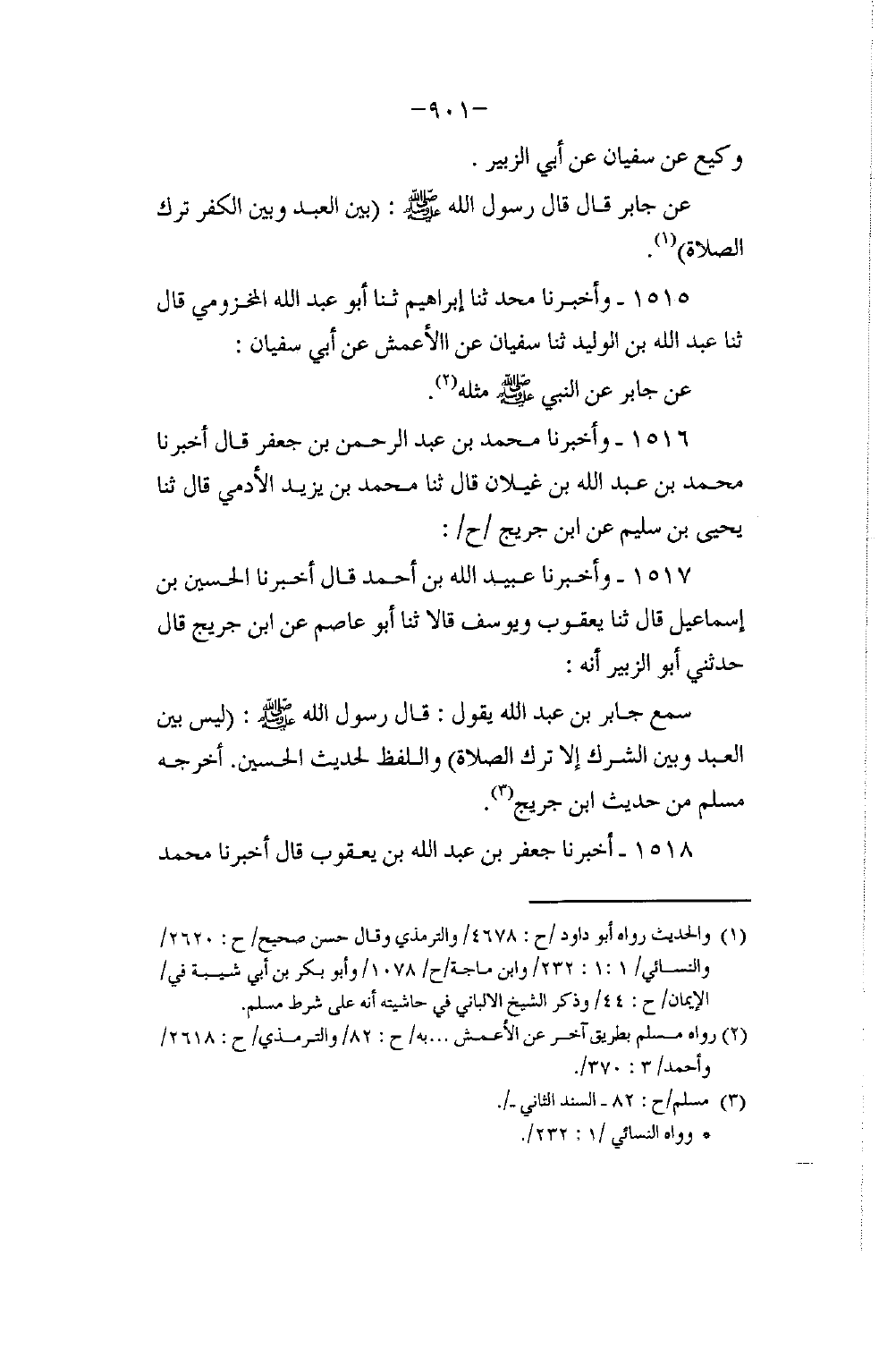 1517 - وَأَخْبَرَنَا عُبَيْدُ اللَّهِ بْنُ أَحْمَدَ، قَالَ: أَخْبَرَنَا الْحُسَيْنُ بْنُ إِسْمَاعِيلَ، قَالَ: ثنا يَعْقُوبُ، وَيُوسُفُ، قَالَا: ثنا أَبُو عَاصِمٍ، عَنِ ابْنِ جُرَيْجٍ، قَالَ: حَدَّثَنِي أَبُو الزُّبَيْرِ أَنَّهُ سَمِعَ جَابِرَ بْنَ عَبْدِ اللَّهِ، يَقُولُ: قَالَ رَسُولُ اللَّهِ صَلَّى اللهُ عَلَيْهِ وَسَلَّمَ: §«لَيْسَ بَيْنَ الْعَبْدِ وَبَيْنَ الشِّرْكِ إِلَّا تَرْكُ الصَّلَاةِ» وَاللَّفْظُ لِحَدِيثِ الْحُسَيْنِ أَخْرَجَهُ مُسْلِمٌ مِنْ حَدِيثِ ابْنِ جُرَيْجٍ