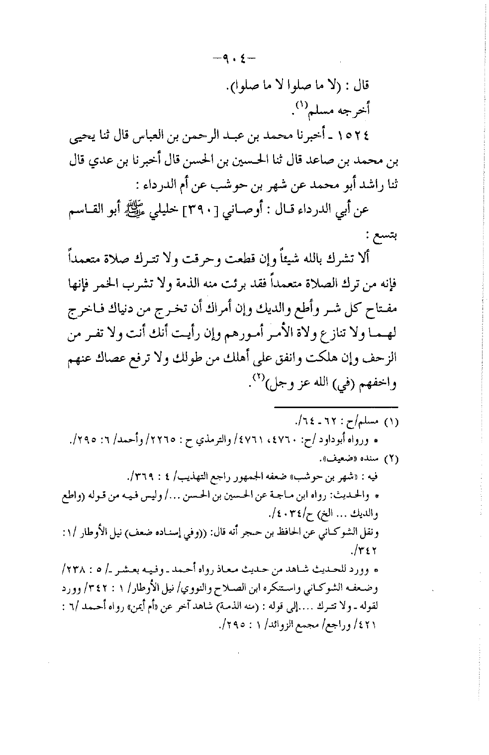 1524 - أَخْبَرَنَا مُحَمَّدُ بْنُ عَبْدِ الرَّحْمَنِ بْنِ الْعَبَّاسِ، قَالَ: ثنا يَحْيَى بْنُ مُحَمَّدِ بْنِ صَاعِدٍ، قَالَ: ثنا الْحُسَيْنُ بْنُ الْحَسَنِ، قَالَ: أَخْبَرَنَا ابْنُ أَبِي عَدِيٍّ، قَالَ: ثنا رَاشِدٌ أَبُو مُحَمَّدٍ، عَنْ شَهْرِ بْنِ حَوْشَبٍ، عَنْ أُمِّ الدَّرْدَاءِ، عَنْ أَبِي الدَّرْدَاءِ، قَالَ: §أَوْصَانِي خَلِيلِي صَلَّى اللهُ عَلَيْهِ وَسَلَّمَ أَبُو الْقَاسِمِ بِتِسْعٍ: «أَلَّا تُشْرِكَ بِاللَّهِ شَيْئًا، وَإِنْ قُطِّعْتَ وَحُرِّقْتَ، وَلَا تَتْرُكْ صَلَاةً مُتَعَمِّدًا؛ فَإِنَّهُ مَنْ تَرَكَ الصَّلَاةَ مُتَعَمِّدًا فَقَدْ بَرِئَتْ مِنْهُ الذِّمَّةُ وَلَا تَشْرَبِ الْخَمْرَ؛ فَإِنَّهَا مِفْتَاحُ كُلِّ شَرٍّ، وَأَطِعْ وَالِدَيْكَ، وَإِنْ أَمَرَاكَ أَنْ تَخْرُجَ مِنْ دُنْيَاكَ فَاخْرُجْ لَهُمَا، وَلَا تُنَازِعْ وُلَاةَ الْأَمْرِ أُمُورَهُمْ، وَإِنْ رَأَيْتَ أَنَّكَ أَنْتَ، وَلَا تَفِرَّ مِنَ الزَّحْفِ وَإِنْ هَلَكْتَ، وَأَنْفِقْ عَلَى أَهْلِكَ مِنْ طَوْلِكَ، وَلَا تَرْفَعْ عَصَاكَ عَنْهُمْ وَأَخِفْهُمْ فِي اللَّهِ عَزَّ وَجَلَّ»