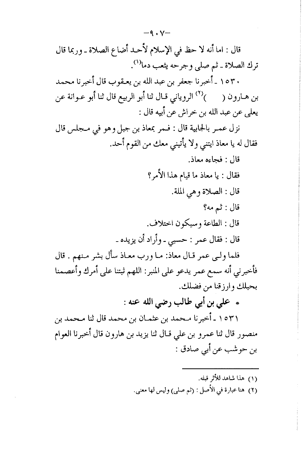 1530 - أَخْبَرَنَا جَعْفَرُ بْنُ عَبْدِ اللَّهِ بْنِ يَعْقُوبَ، قَالَ: أَخْبَرَنَا مُحَمَّدُ بْنُ هَارُونَ الرُّويَانِيُّ، قَالَ: ثنا أَبُو الرَّبِيعِ، قَالَ: ثنا أَبُو عَوَانَةَ، عَنْ يَعْلَى، عَنْ عَبْدِ اللَّهِ بْنِ خِرَاشٍ، عَنْ أَبِيهِ، قَالَ: " نَزَلَ عُمَرُ بِالْجَابِيَةِ قَالَ: فَمَرَّ بِمُعَاذِ بْنِ جَبَلٍ وَهُوَ فِي مَجْلِسٍ، قَالَ: فَقَالَ لَهُ: يَا مُعَاذُ، ايْتِنِي وَلَا يَأْتِنِي مَعَكَ مِنَ الْقَوْمِ أَحَدٌ، قَالَ: فَجَاءَهُ مُعَاذٌ، فَقَالَ: يَا مُعَاذُ، §مَا قِيَامُ هَذَا الْأَمْرِ؟ قَالَ: الصَّلَاةُ، وَهِيَ الْمِلَّةُ، قَالَ: ثُمَّ مَهْ؟ قَالَ: ثُمَّ الطَّاعَةُ، وَسَيَكُونُ اخْتِلَافٌ، قَالَ: فَقَالَ عُمَرُ: حَسْبِي وَأَرَادَ أَنْ يَزِيدَهُ فَلَمَّا وُلِّيَ عُمَرُ قَالَ مُعَاذٌ: مَا وَرَبِّ مُعَاذٍ سَأَلَ بَشَرٌ مِنْهُمْ، قَالَ فَأَخْبَرَنِي أَنَّهُ سَمِعَ عُمَرَ يَدْعُو عَلَى الْمِنْبَرِ اللَّهُمَّ، ثَبِّتْنَا عَلَى أَمْرِكَ وَاعْصِمْنَا بِحَبْلِكَ وَارْزُقْنَا مِنْ فَضْلِكَ "