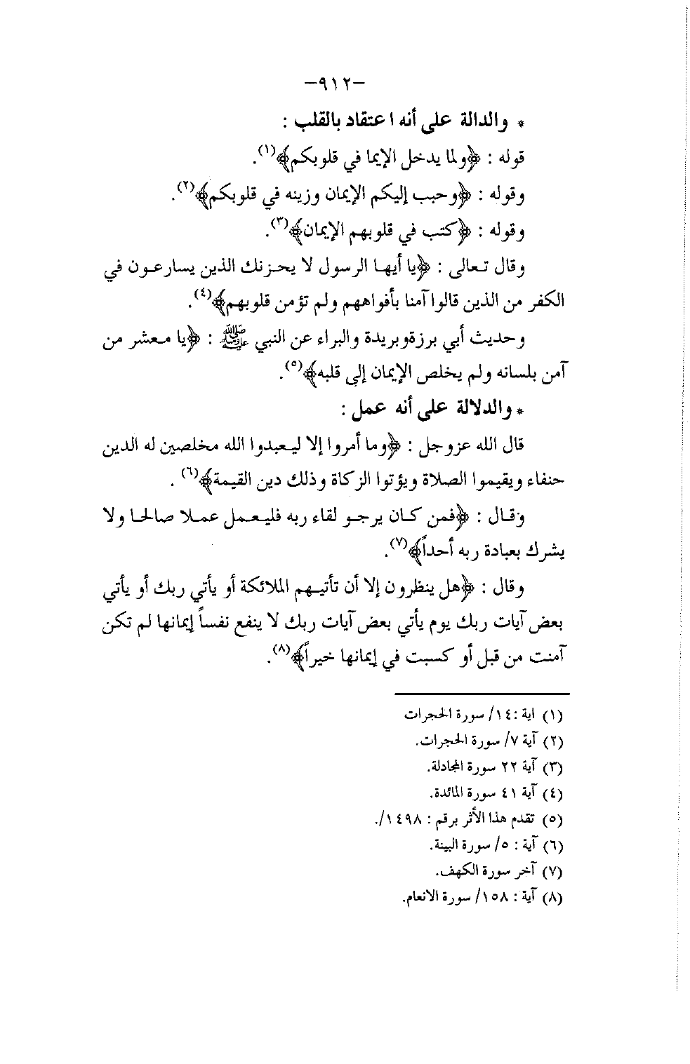 -[913]-، وَحَدِيثُ الْأَعْرَابِيِّ لَمَّا عَدَّ عَلَيْهِ النَّبِيُّ الْأَعْمَالَ: «فَإِذَا فَعَلْتَ ذَلِكَ فَقَدْ آمَنْتَ» ، فَدَلَّ عَلَى أَنَّ مَجْمُوعَ هَذِهِ الْأَفْعَالِ إِذَا أَتَى بِهَا فَهُوَ مُؤْمِنٌ