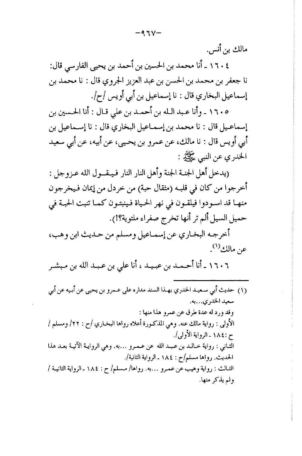 1605 - وأنا عَبْدُ اللَّهِ بْنُ أَحْمَدَ بْنِ عَلِيٍّ، قَالَ: أنا الْحُسَيْنُ بْنُ إِسْمَاعِيلَ، قَالَ: نا مُحَمَّدُ بْنُ إِسْمَاعِيلَ الْبُخَارِيُّ، قَالَ: نا إِسْمَاعِيلُ بْنُ أَبِي أُوَيْسٍ، قَالَ: نا مَالِكٌ، عَنْ عَمْرِو بْنِ يَحْيَى، عَنْ أَبِيهِ، عَنْ أَبِي سَعِيدٍ الْخُدْرِيِّ، عَنِ النَّبِيِّ صَلَّى اللهُ عَلَيْهِ وَسَلَّمَ: " يَدْخُلُ أَهْلُ الْجَنَّةِ الْجَنَّةَ، وَأَهْلُ النَّارِ النَّارَ فَيَقُولُ اللَّهُ عَزَّ وَجَلَّ: §أَخْرِجُوا مَنْ كَانَ فِي قَلْبِهِ مِثْقَالُ حَبَّةٍ مِنْ خَرْدَلٍ مِنْ إِيمَانٍ فَيَخْرُجُونَ مِنْهَا قَدِ اسْوَدُّوا فَيُلْقَوْنَ فِي نَهْرِ الْحَيَاةِ، فَيَنْبُتُونَ كَمَا تَنْبُتُ الْحَبَّةُ فِي حَمِيلِ السَّيْلِ أَلَمْ تَرَ أَنَّهَا تَخْرُجُ صَفْرَاءَ مُلْتَوِيَةً؟ " أَخْرَجَهُ الْبُخَارِيُّ عَنْ إِسْمَاعِيلَ، وَمُسْلِمٌ مِنْ حَدِيثِ ابْنِ وَهْبٍ، عَنْ مَالِكٍ