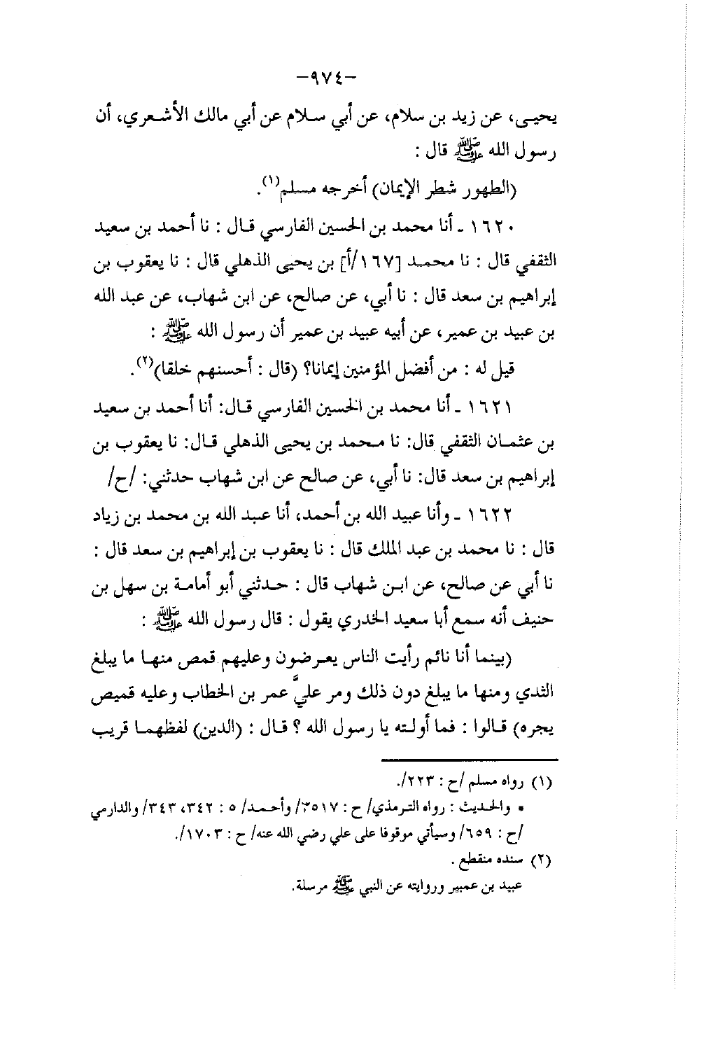 1620 - أنا مُحَمَّدُ بْنُ الْحُسَيْنِ الْفَارِسِيُّ، قَالَ: نا أَحْمَدُ بْنُ سَعِيدٍ الثَّقَفِيُّ، قَالَ: نا مُحَمَّدُ بْنُ يَحْيَى الذُّهْلِيُّ، قَالَ: نا يَعْقُوبُ بْنُ إِبْرَاهِيمَ بْنِ سَعْدٍ، قَالَ: نا أَبِي، عَنْ صَالِحٍ، عَنِ ابْنِ شِهَابٍ، عَنْ عَبْدِ اللَّهِ بْنِ عُبَيْدِ بْنِ عُمَيْرٍ، عَنْ أَبِيهِ عُبَيْدِ بْنِ عُمَيْرٍ أَنَّ رَسُولَ اللَّهِ صَلَّى اللهُ عَلَيْهِ وَسَلَّمَ: قِيلَ لَهُ: مَنْ §أَفْضَلُ الْمُؤْمِنِينَ إِيمَانًا؟ قَالَ: «أَحْسَنُهُمْ خُلُقًا»