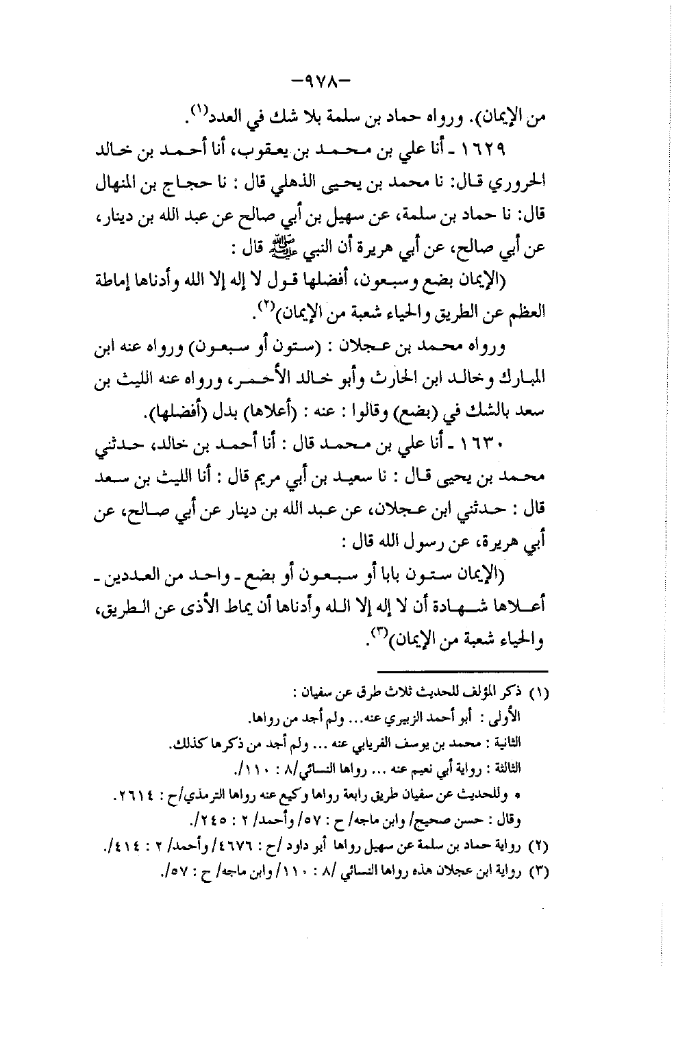1629 - أنا عَلِيُّ بْنُ مُحَمَّدِ بْنِ أَحْمَدَ بْنِ يَعْقُوبَ، أنا أَحْمَدُ بْنُ خَالِدٍ الْحَرُورِيُّ، قَالَ: نا مُحَمَّدُ بْنُ يَحْيَى الذُّهْلِيُّ، قَالَ: نا حَجَّاجُ بْنُ الْمِنْهَالِ، قَالَ: نا حَمَّادُ بْنُ سَلَمَةَ، عَنْ سُهَيْلِ بْنِ أَبِي صَالِحٍ، عَنْ عَبْدِ اللَّهِ بْنِ دِينَارٍ، عَنْ أَبِي صَالِحٍ، عَنْ أَبِي هُرَيْرَةَ أَنَّ النَّبِيَّ صَلَّى اللهُ عَلَيْهِ وَسَلَّمَ قَالَ: " §الْإِيمَانُ بِضْعٌ وَسَبْعُونَ، أَفْضَلُهَا قَوْلُ: لَا إِلَهَ إِلَّا اللَّهُ، وَأَدْنَاهَا إِمَاطَةُ الْعَظْمِ عَنِ الطَّرِيقِ، وَالْحَيَاءُ شُعْبَةٌ مِنَ الْإِيمَانِ ". وَرَوَاهُ مُحَمَّدُ بْنُ عَجْلَانَ: سِتُّونَ أَوْ سَبْعُونَ، وَرَوَاهُ عَنْهُ ابْنُ الْمُبَارَكِ، وَخَالِدُ بْنُ الْحَارِثِ، وَأَبُو خَالِدٍ الْأَحْمَرُ، وَرَوَاهُ عَنْهُ اللَّيْثُ بْنُ سَعْدٍ بِالشَّكِّ فِي بِضْعٍ وَقَالُوا عَنْهُ: «أَعْلَاهَا» ، بَدَلَ «أَفْضَلُهَا»