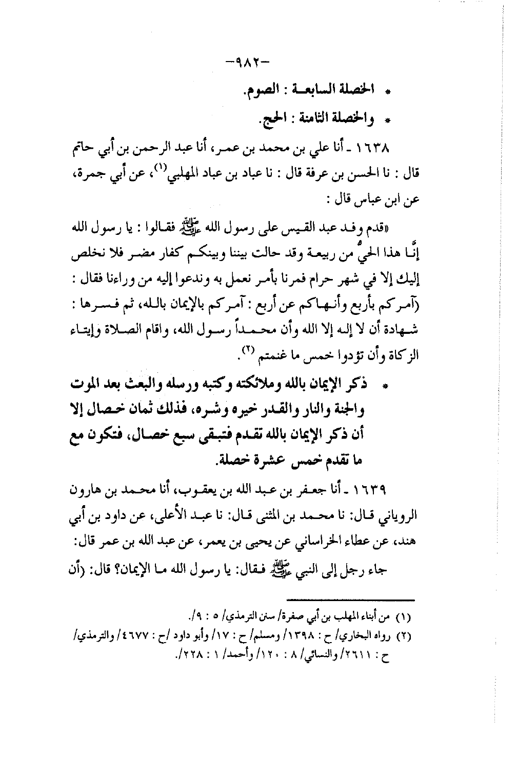1638 - أنا عَلِيُّ بْنُ مُحَمَّدِ بْنِ عُمَرَ، أنا عَبْدُ الرَّحْمَنِ بْنُ أَبِي حَاتِمٍ، قَالَ: نا الْحَسَنُ بْنُ عَرَفَةَ، قَالَ: نا عَبَّادٌ الْمُهَلَّبِيُّ، عَنْ أَبِي جَمْرَةَ، عَنِ ابْنِ عَبَّاسٍ، قَالَ: " قَدِمَ وَفْدُ عَبْدِ الْقَيْسِ عَلَى رَسُولِ اللَّهِ صَلَّى اللهُ عَلَيْهِ وَسَلَّمَ، فَقَالُوا: يَا رَسُولَ اللَّهِ، إِنَّا هَذَا الْحَيُّ مِنْ رَبِيعَةَ، وَقَدْ حَالَتْ بَيْنَنَا وَبَيْنَكُمْ كُفَّارُ مُضَرَ فَلَا نَخْلُصُ إِلَيْكَ إِلَّا فِي شَهْرٍ حَرَامٍ، فَمُرْنَا بِأَمْرٍ نَعْمَلُ بِهِ وَنَدْعُو إِلَيْهِ مَنْ وَرَاءَنَا فَقَالَ: " §آمُرُكُمْ بِأَرْبَعٍ، وَأَنْهَاكُمْ عَنْ أَرْبَعٍ: آمُرُكُمْ بِالْإِيمَانِ بِاللَّهِ «، ثُمَّ فَسَّرَهَا لَهُمْ» شَهَادَةُ أَنْ لَا إِلَهَ إِلَّا اللَّهُ، وَأَنَّ مُحَمَّدًا رَسُولُ اللَّهِ، وَإِقَامُ الصَّلَاةِ، وَإِيتَاءُ الزَّكَاةِ، وَأَنْ تُؤَدُّوا خُمُسَ مَا غَنِمْتُمْ "