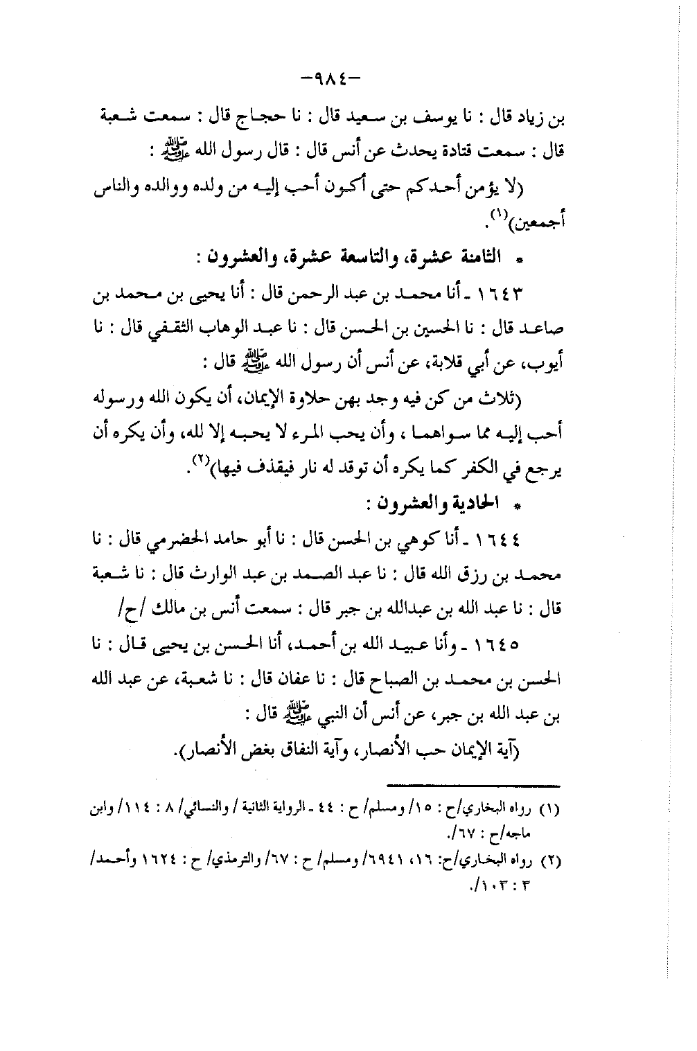 1643 - أنا مُحَمَّدُ بْنُ عَبْدِ الرَّحْمَنِ، قَالَ: أنا يَحْيَى بْنُ مُحَمَّدِ بْنِ صَاعِدٍ، قَالَ: نا الْحُسَيْنُ بْنُ الْحَسَنِ، قَالَ: نا عَبْدُ الْوَهَّابِ الثَّقَفِيُّ، قَالَ: نا أَيُّوبُ، عَنْ أَبِي قِلَابَةَ، عَنْ أَنَسٍ، أَنَّ رَسُولَ اللَّهِ صَلَّى اللهُ عَلَيْهِ وَسَلَّمَ قَالَ: " §ثَلَاثٌ مَنْ كُنَّ فِيهِ وَجَدَ بِهِنَّ حَلَاوَةَ الْإِيمَانِ: أَنْ يَكُونَ اللَّهُ وَرَسُولُهُ أَحَبَّ إِلَيْهِ مِمَّا سِوَاهُمَا، وَأَنْ يُحِبَّ الْمَرْءَ لَا يُحِبُّهُ إِلَّا لِلَّهِ، وَأَنْ يَكْرَهَ أَنْ يَرْجِعَ فِي الْكُفْرِ كَمَا يَكْرَهُ أَنْ تُوقَدَ لَهُ نَارٌ فَيُقْذَفَ فِيهَا "