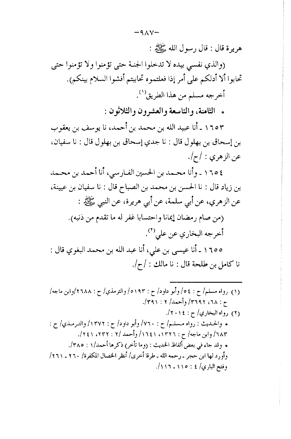 1654 - وأنا مُحَمَّدُ بْنُ الْحُسَيْنِ الْفَارِسِيُّ، أنا أَحْمَدُ بْنُ مُحَمَّدِ بْنِ زِيَادٍ، قَالَ: نا الْحَسَنُ بْنُ مُحَمَّدِ بْنِ الصَّبَّاحِ، قَالَ: نا سُفْيَانُ بْنُ عُيَيْنَةَ، عَنِ الزُّهْرِيِّ، عَنْ أَبِي سَلَمَةَ، عَنْ أَبِي هُرَيْرَةَ، عَنِ النَّبِيِّ صَلَّى اللهُ عَلَيْهِ وَسَلَّمَ: §«مَنْ صَامَ رَمَضَانَ إِيمَانًا وَاحْتِسَابًا غُفِرَ لَهُ مَا تَقَدَّمَ مِنْ ذَنْبِهِ» أَخْرَجَهُ الْبُخَارِيُّ، عَنْ عَلِيٍّ