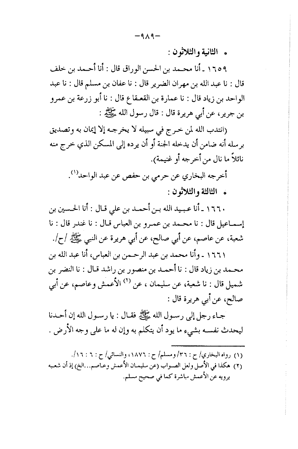 1659 - أنا مُحَمَّدُ بْنُ الْحَسَنِ الْوَرَّاقُ، قَالَ: أنا أَحْمَدُ بْنُ خَلَفٍ، قَالَ: نا عَبْدُ اللَّهِ بْنُ مِهْرَانَ الضَّرِيرُ، قَالَ: نا عَفَّانُ بْنُ مُسْلِمٍ، قَالَ: نا عَبْدُ الْوَاحِدِ بْنُ زِيَادٍ، قَالَ: نا عُمَارَةُ بْنُ الْقَعْقَاعِ، قَالَ: نا أَبُو زُرْعَةَ بْنُ عَمْرِو بْنِ جَرِيرٍ، عَنْ أَبِي هُرَيْرَةَ، قَالَ: قَالَ رَسُولُ اللَّهِ صَلَّى اللهُ عَلَيْهِ وَسَلَّمَ: §«انْتَدَبَ اللَّهُ لِمَنْ خَرَجَ فِي سَبِيلِهِ لَا يُخْرِجُهُ إِلَّا إِيمَانٌ بِهِ، وَتَصْدِيقٌ بِرُسُلِهِ أَنَّهُ ضَامِنٌ أَنْ يُدْخِلَهُ الْجَنَّةَ، أَوْ أَنْ يَرُدَّهُ إِلَى الْمَسْكَنِ الَّذِي خَرَجَ مِنْهُ نَائِلًا مَا نَالَ مِنْ أَجْرٍ، أَوْ غَنِيمَةٍ» . أَخْرَجَهُ الْبُخَارِيُّ عَنْ حَرَمِيِّ بْنِ حَفْصٍ، عَنْ عَبْدِ الْوَاحِدِ