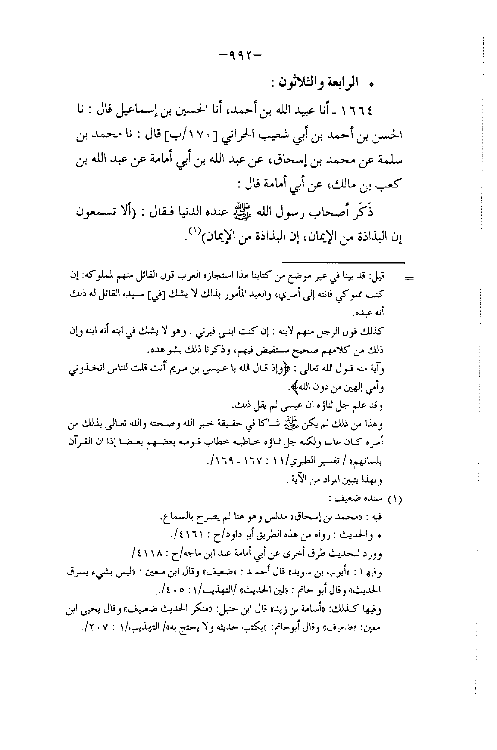 1664 - أنا عُبَيْدُ اللَّهِ بْنُ أَحْمَدَ، أنا الْحَسَنُ بْنُ إِسْمَاعِيلَ، قَالَ: نا الْحَسَنُ بْنُ أَحْمَدَ بْنِ أَبِي شُعَيْبٍ الْحَرَّانِيُّ، قَالَ: نا مُحَمَّدُ بْنُ سَلَمَةَ، عَنْ مُحَمَّدِ بْنِ إِسْحَاقَ، عَنْ عَبْدِ اللَّهِ بْنِ أَبِي أُمَامَةَ، عَنْ عَبْدِ اللَّهِ بْنِ كَعْبِ بْنِ مَالِكٍ، عَنْ أَبِي أُمَامَةَ، قَالَ: ذَكَرَ أَصْحَابُ رَسُولِ اللَّهِ صَلَّى اللهُ عَلَيْهِ وَسَلَّمَ عِنْدَهُ الدُّنْيَا فَقَالَ: «أَلَا تَسْمَعُونَ، إِنَّ §الْبَذَاذَةَ مِنَ الْإِيمَانِ، إِنَّ الْبَذَاذَةَ مِنَ الْإِيمَانِ»