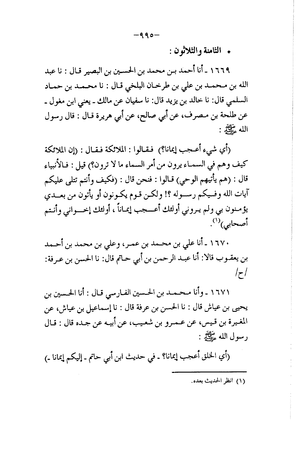 1669 - أنا أَحْمَدُ بْنُ مُحَمَّدِ بْنِ الْحُسَيْنِ بْنِ الْبَصِيرِ، قَالَ: نا عَبْدُ اللَّهِ بْنُ مُحَمَّدِ بْنِ عَلِيِّ بْنِ طَرْخَانَ الْبَلْخِيُّ، قَالَ: نا مُحَمَّدُ بْنُ حَمَّادٍ السُّلَمِيُّ، قَالَ: نا خَالِدُ بْنُ يَزِيدَ، قَالَ: نا سُفْيَانُ، عَنْ مَالِكٍ، يَعْنِي ابْنَ مِغْوَلٍ عَنْ طَلْحَةَ بْنِ مُصَرِّفٍ، عَنْ أَبِي صَالِحٍ، عَنْ أَبِي هُرَيْرَةَ، قَالَ: قَالَ رَسُولُ اللَّهِ صَلَّى اللهُ عَلَيْهِ وَسَلَّمَ: «§أَيُّ شَيْءٍ أَعْجَبُ إِيمَانًا؟» فَقَالُوا: الْمَلَائِكَةُ، فَقَالَ: «إِنِ الْمَلَائِكَةُ، كَيْفَ وَهُمْ فِي السَّمَاءِ يَرَوْنَ مِنْ أَمْرِ السَّمَاءِ مَا لَا تَرَوْنَ؟» قِيلَ: فَالْأَنْبِيَاءُ، قَالَ: «هُمْ يَأْتِيهِمُ الْوَحْيُ» قَالُوا: فَنَحْنُ، قَالَ: «فَكَيْفَ وَأَنْتُمْ تُتْلَى عَلَيْكُمْ آيَاتُ اللَّهِ وَفِيكُمْ رَسُولُهُ؟ وَلَكِنْ قَوْمٌ يَكُونُونَ أَوْ يَأْتُونَ مِنْ بَعْدِي يُؤْمِنُونَ بِي، وَلَمْ يَرَوْنِي أُولَئِكَ أَعْجَبُ إِيمَانًا، أُولَئِكَ إِخْوَانِي وَأَنْتُمْ أَصْحَابِي»