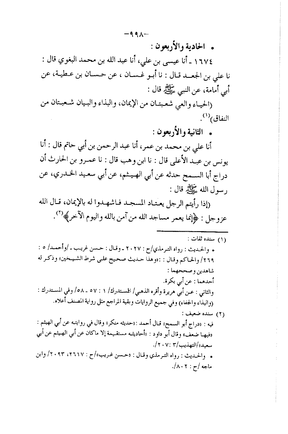 1674 - أنا عِيسَى بْنُ عَلِيٍّ، أنا عَبْدُ اللَّهِ بْنُ مُحَمَّدٍ الْبَغَوِيُّ، قَالَ: نا عَلِيُّ بْنُ الْجَعْدِ، قَالَ: نا أَبُو غَسَّانَ، عَنْ حَسَّانَ بْنِ عَطِيَّةَ، عَنْ أَبِي أُمَامَةَ، عَنِ النَّبِيِّ صَلَّى اللهُ عَلَيْهِ وَسَلَّمَ قَالَ: «§الْحَيَاءُ وَالْعِيُّ شُعْبَتَانِ مِنَ الْإِيمَانِ، وَالْبَذَاءُ وَالْبَيَانُ شُعْبَتَانِ مِنَ النِّفَاقِ»