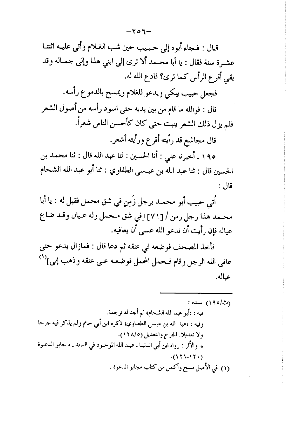 أخبرنا عَلِيٌّ، أنا الْحُسَيْنُ، ثنا عَبْدُ اللَّهِ، قَالَ: ثنا مُحَمَّدُ بْنُ الْحُسَيْنِ، قَالَ: ثنا عَبْدُ اللَّهِ بْنُ عِيسَى الطُّفَاوِيُّ، ثنا أَبُو عَبْدِ اللَّهِ الشَّحَّامُ، قَالَ: أُتِيَ حَبِيبٌ أَبُو مُحَمَّدٍ بِرَجُلٍ زَمِنٍ فِي شِقِّ مَحْمَلٍ فَقِيلَ لَهُ: يَا أَبَا مُحَمَّدٍ هَذَا §رَجُلٌ زَمِنٌ فِي شِقِّ مَحْمَلٍ وَلَهُ عِيَالٌ وَقَدْ ضَاعَ عِيَالُهُ فَإِنْ رَأَيْتَ أَنْ تَدْعُوَ اللَّهُ عَسَى أَنَّ يُعَافِيَهُ، فَأَخَذَ الْمُصْحَفَ فَوَضَعَهُ فِي عُنُقِهِ ثُمَّ دَعَا، قَالَ: فَمَا زَالَ يَدْعُو حَتَّى عَافَى اللَّهُ الرَّجُلَ وَقَامَ فَحَمَلَ الْمَحْمَلَ فَوَضَعَهُ عَلَى عُنُقِهِ وَذَهَبَ إِلَى عِيَالِهِ